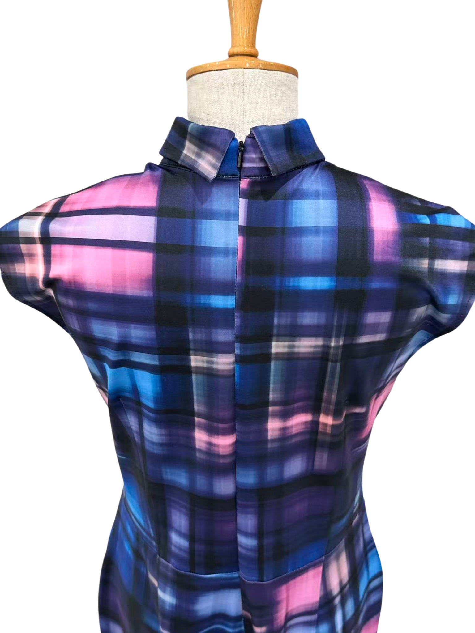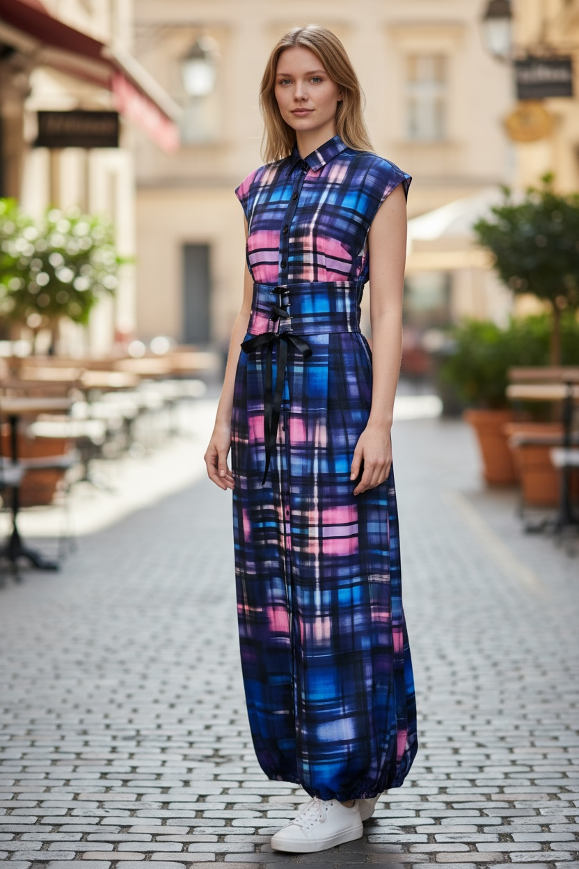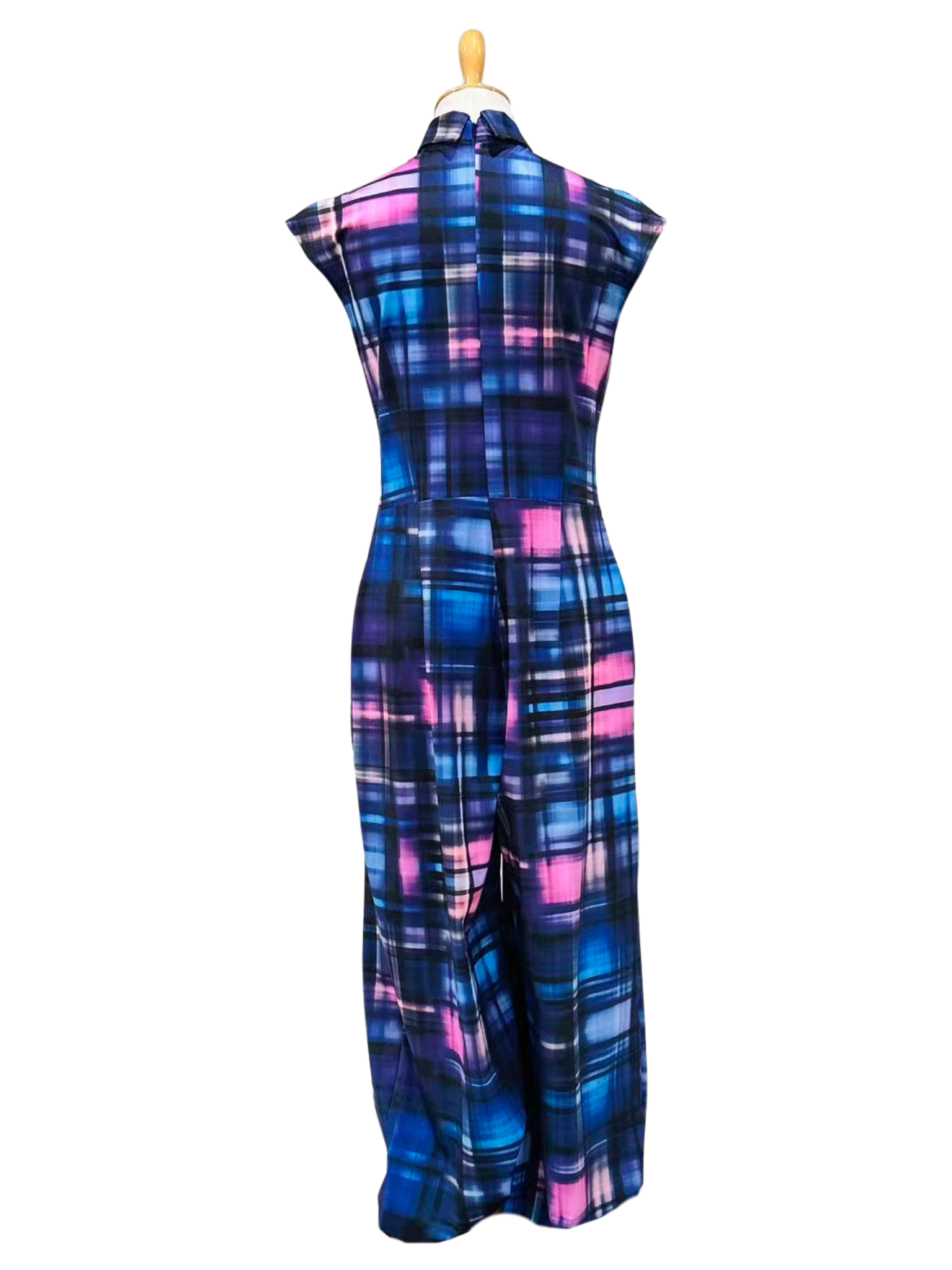 鮮やかなプレイド柄が目を引くオールインワンは、1枚で華やかさと洗練を両立する主役アイテム。