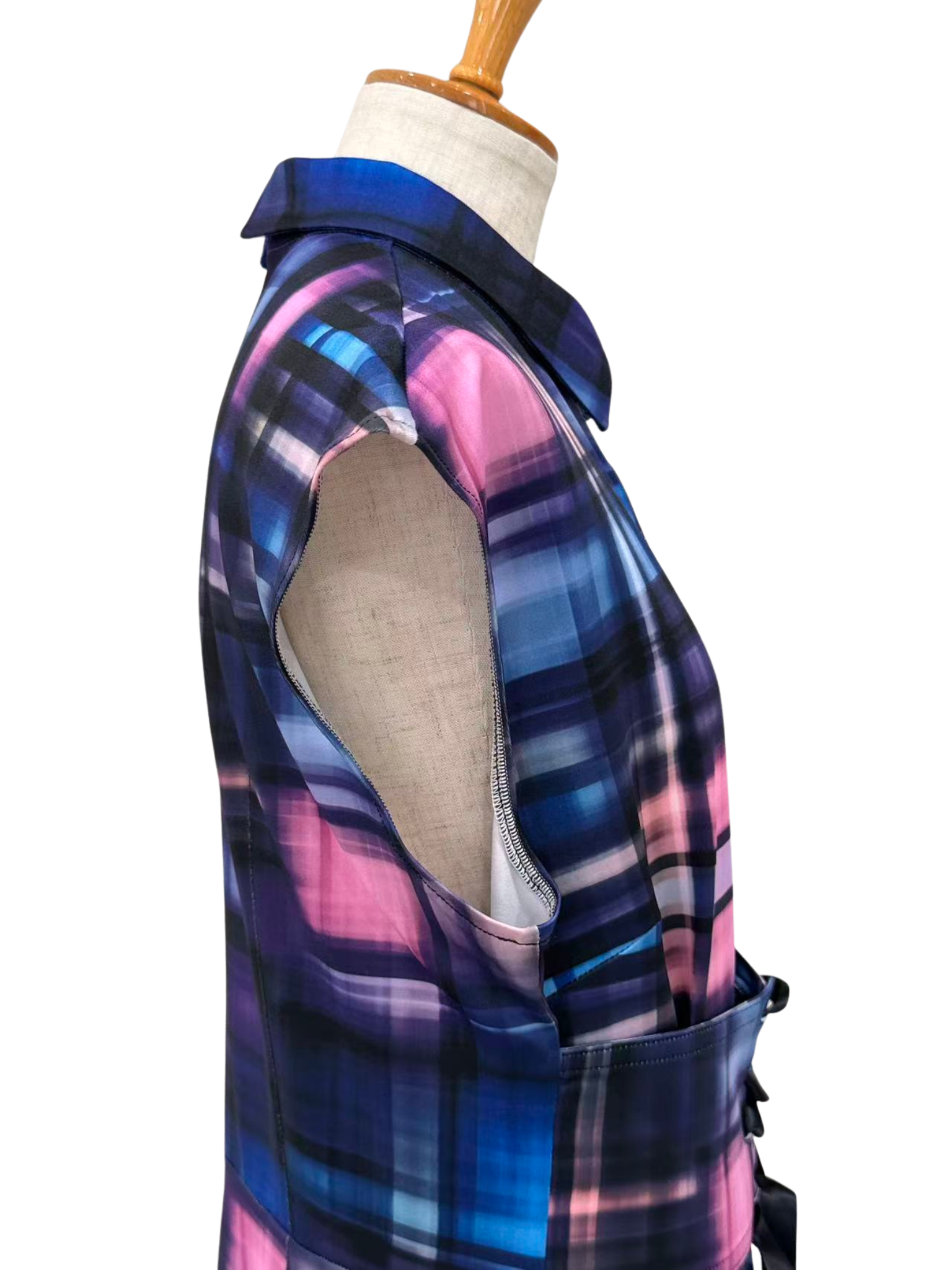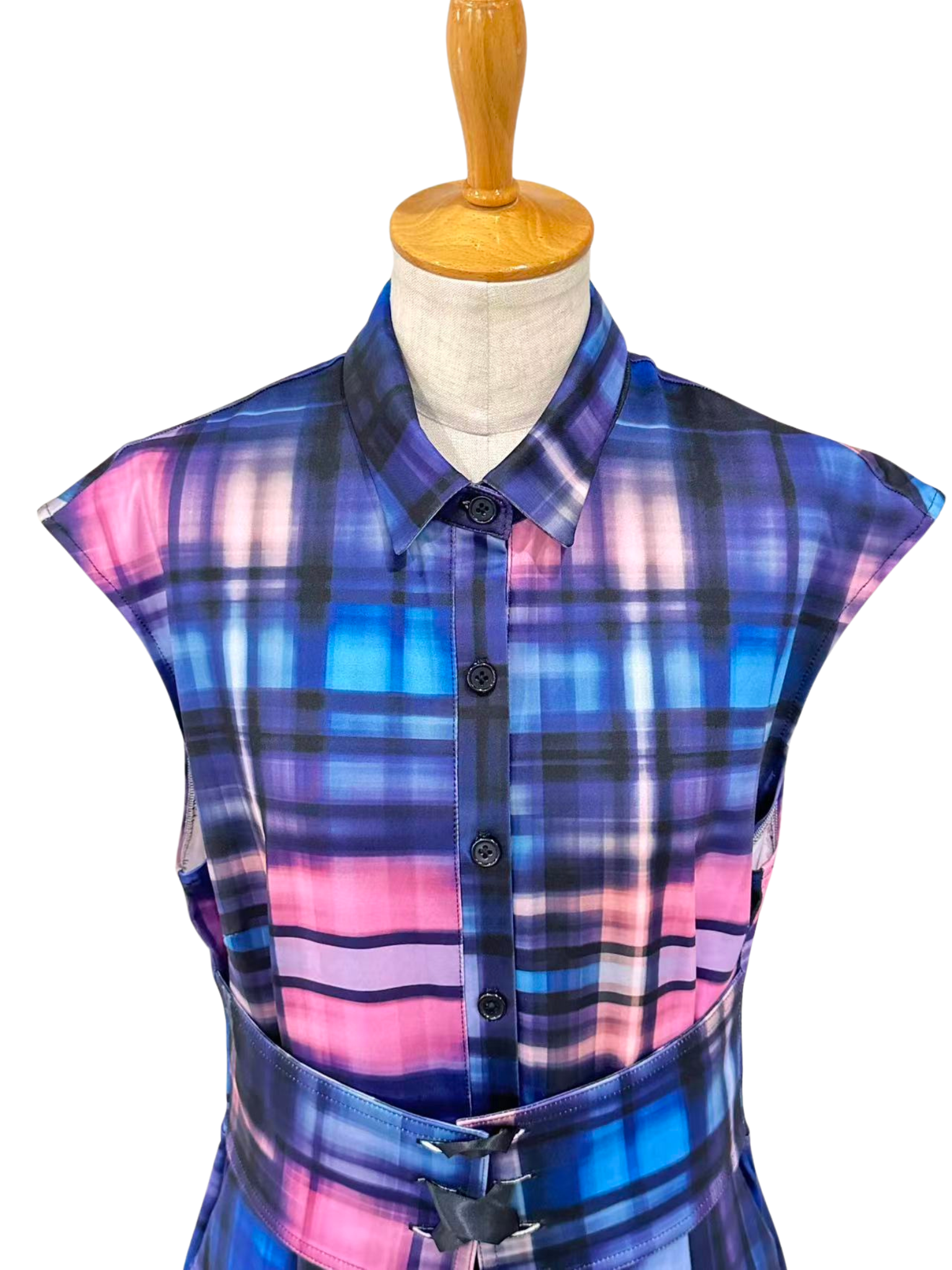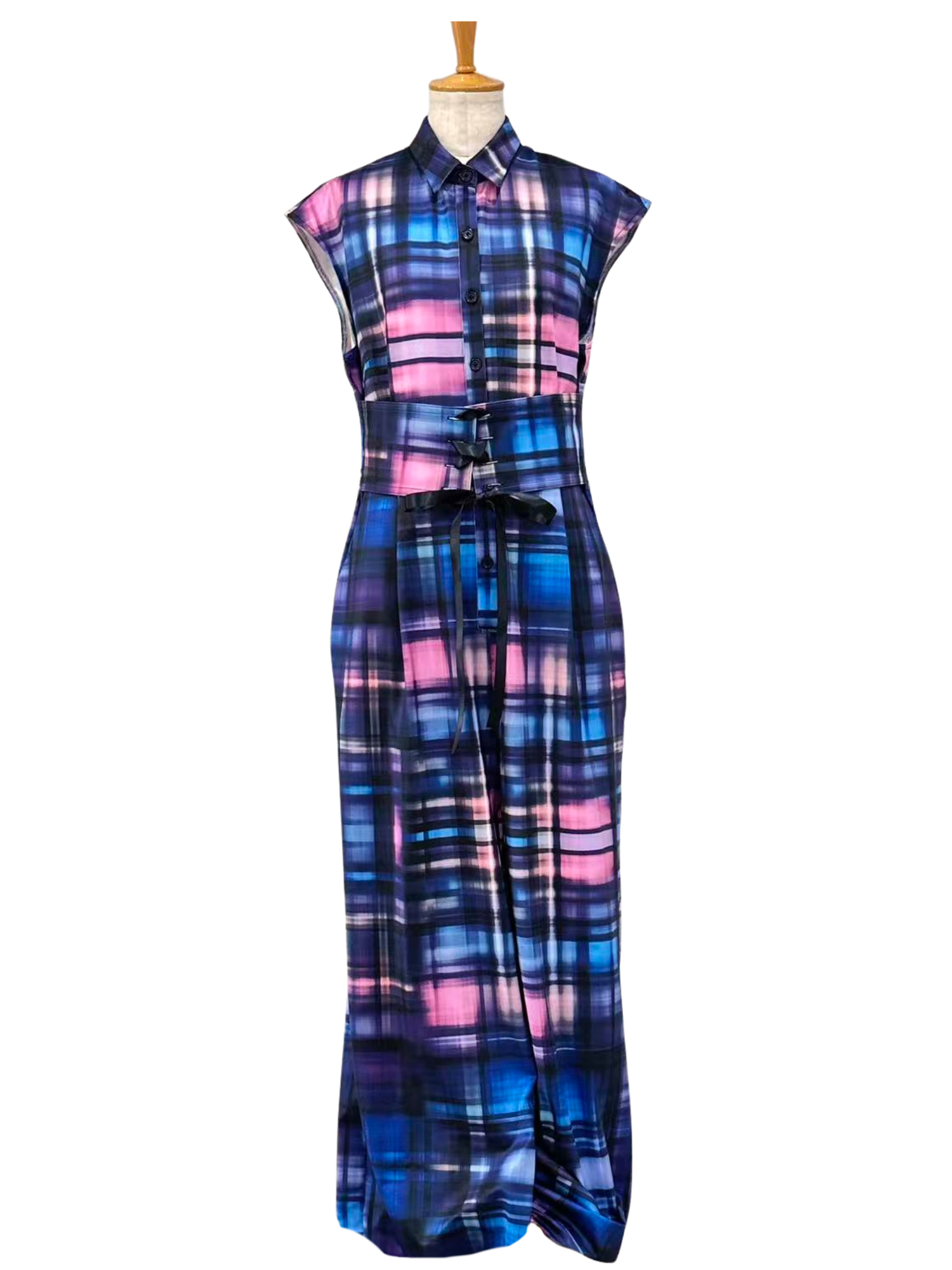 ノースリーブ×シャツカラーの組み合わせが、程よくきちんと感を演出し、ウエストの共布ベルトでメリハリのあるシルエットに。