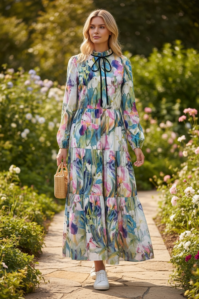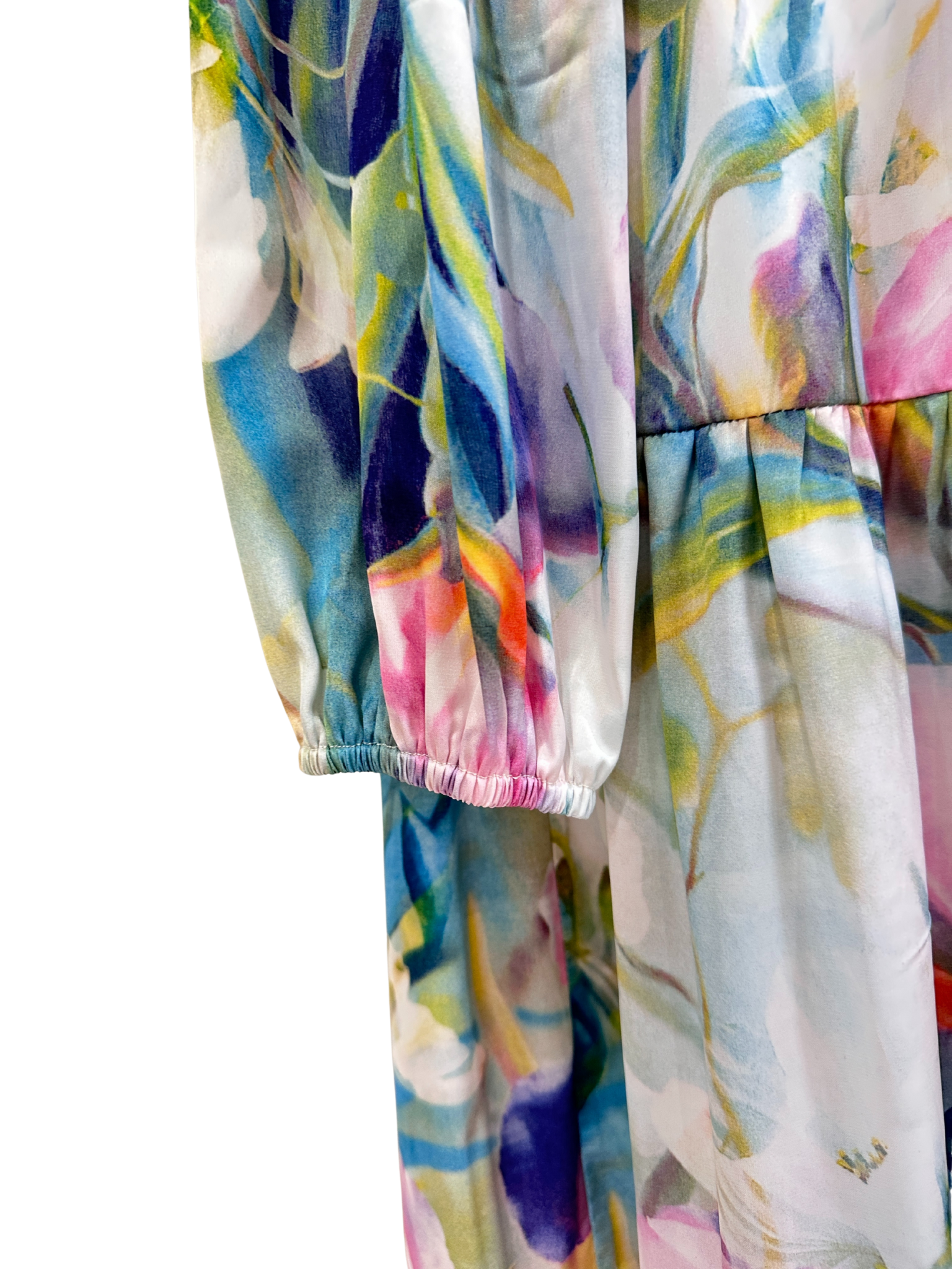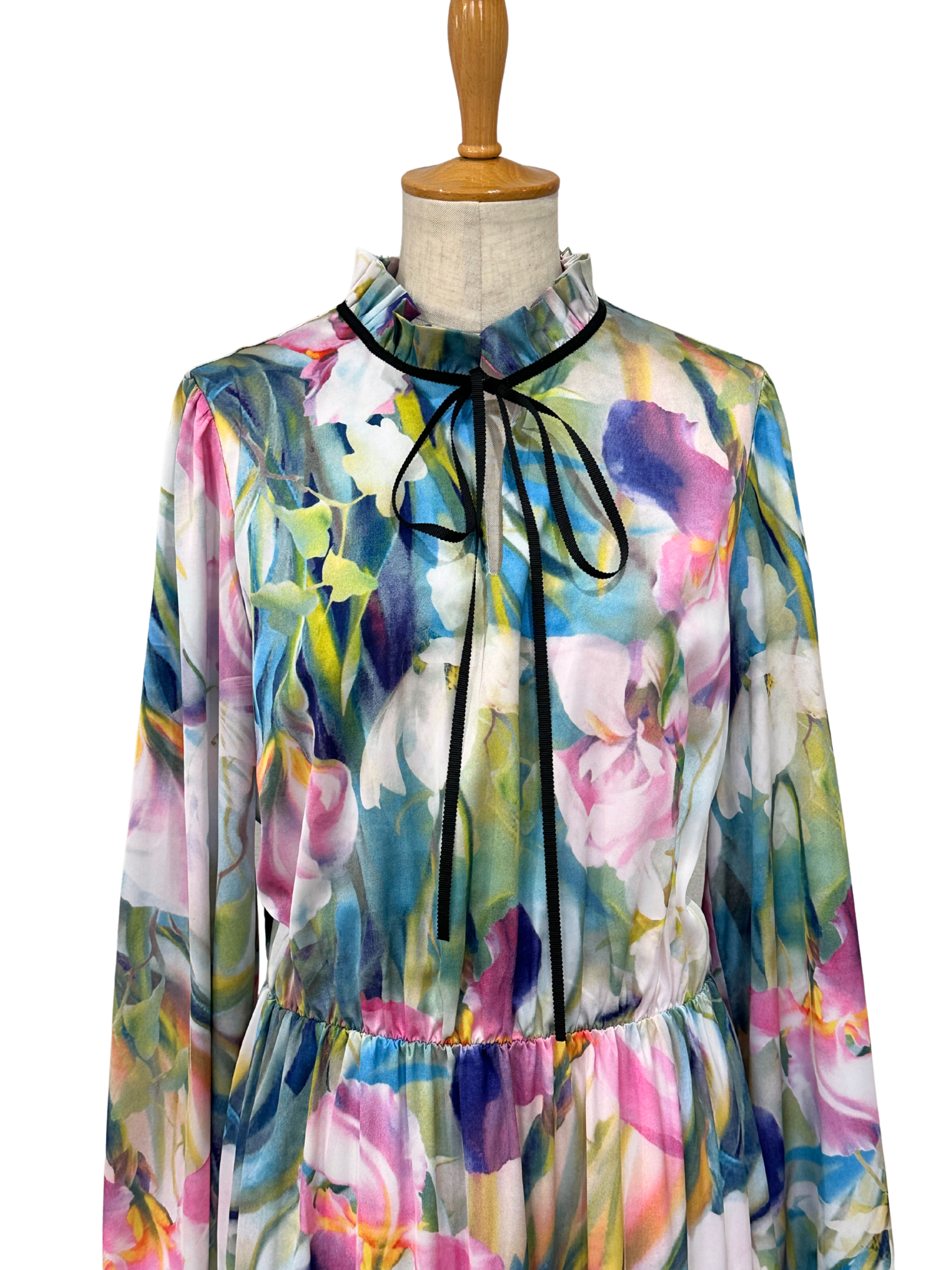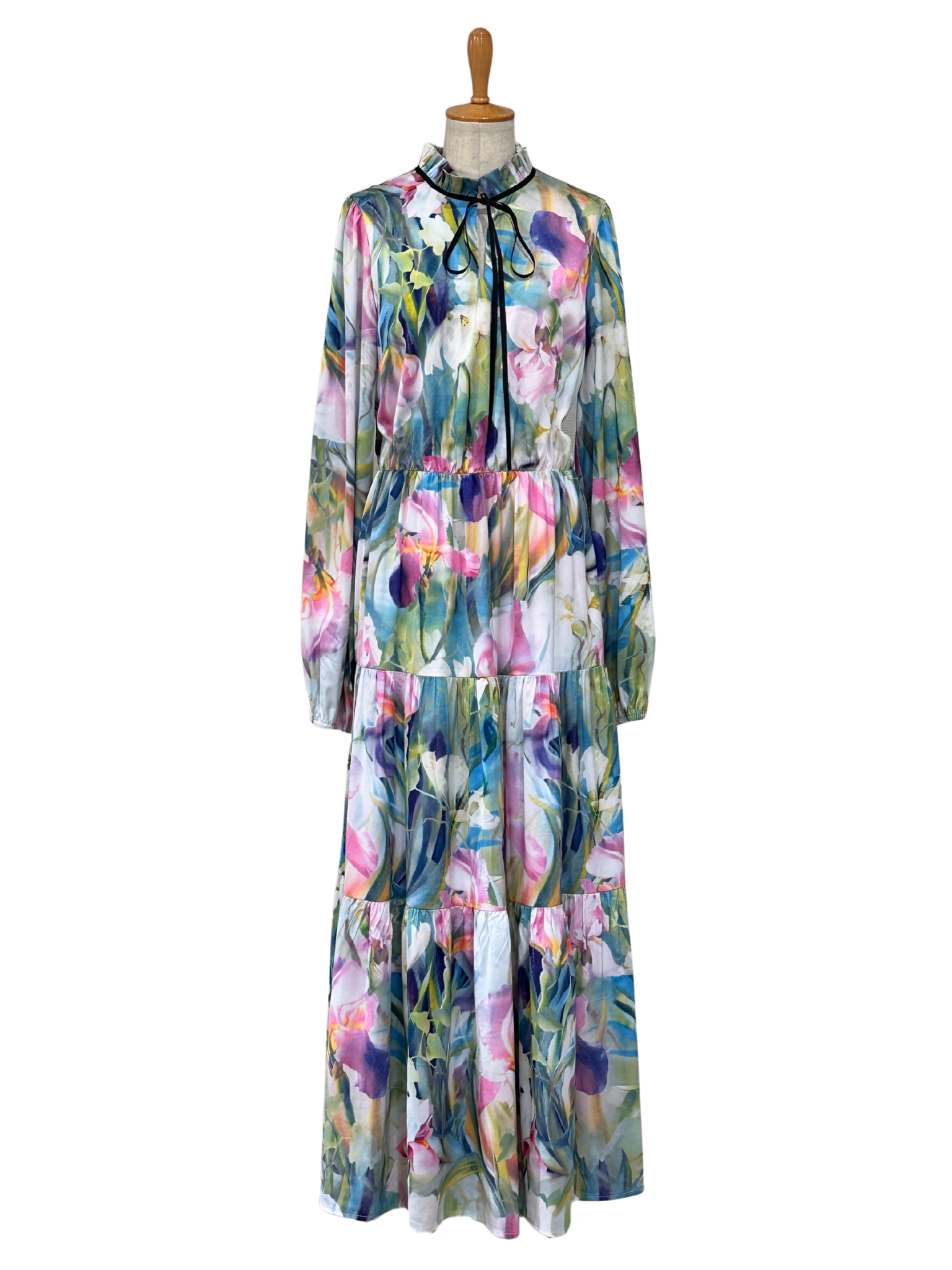 淡いパステルカラーの花々が、抽象画のように溶け合うフラワープリントが印象的なワンピース。