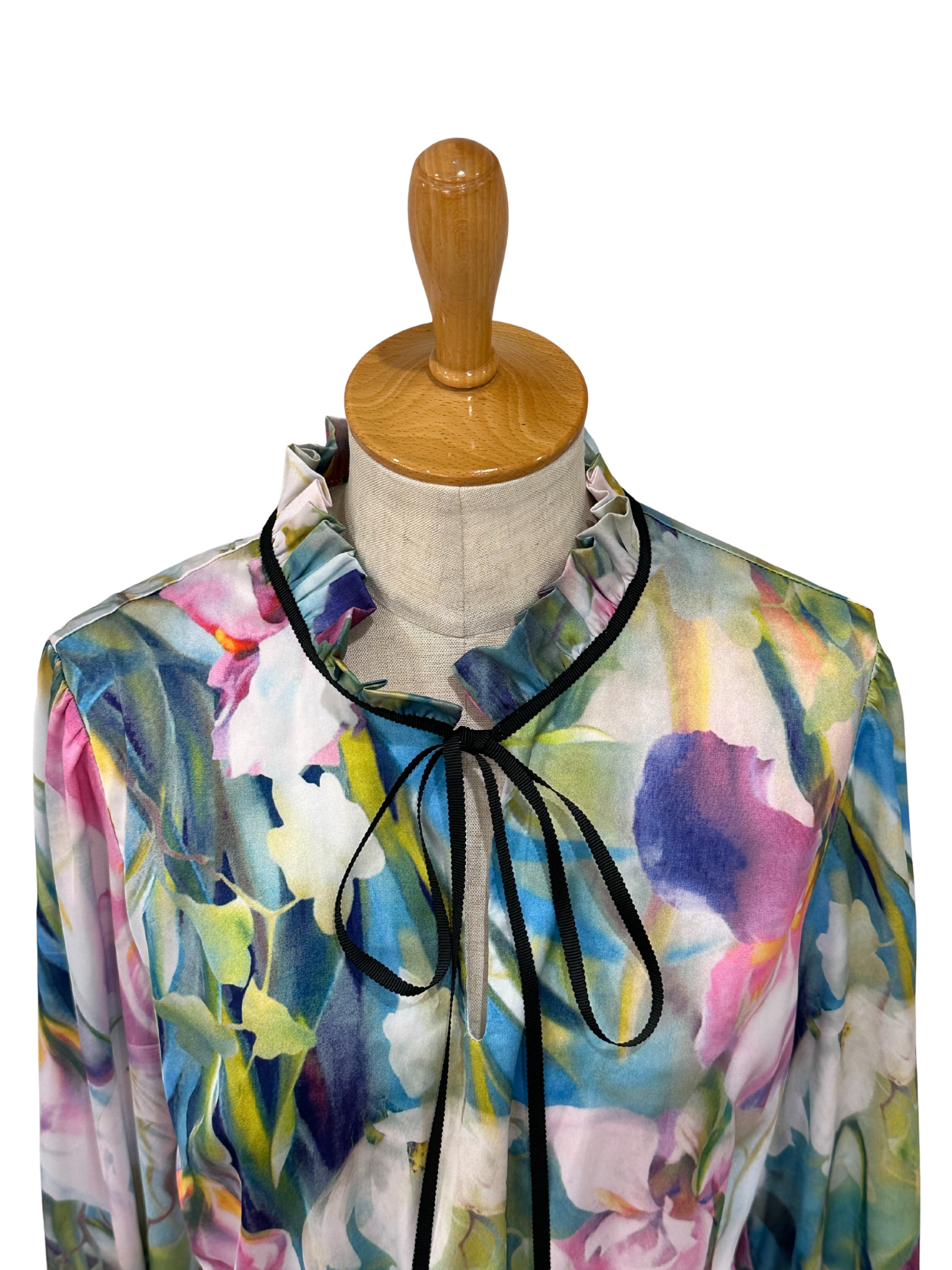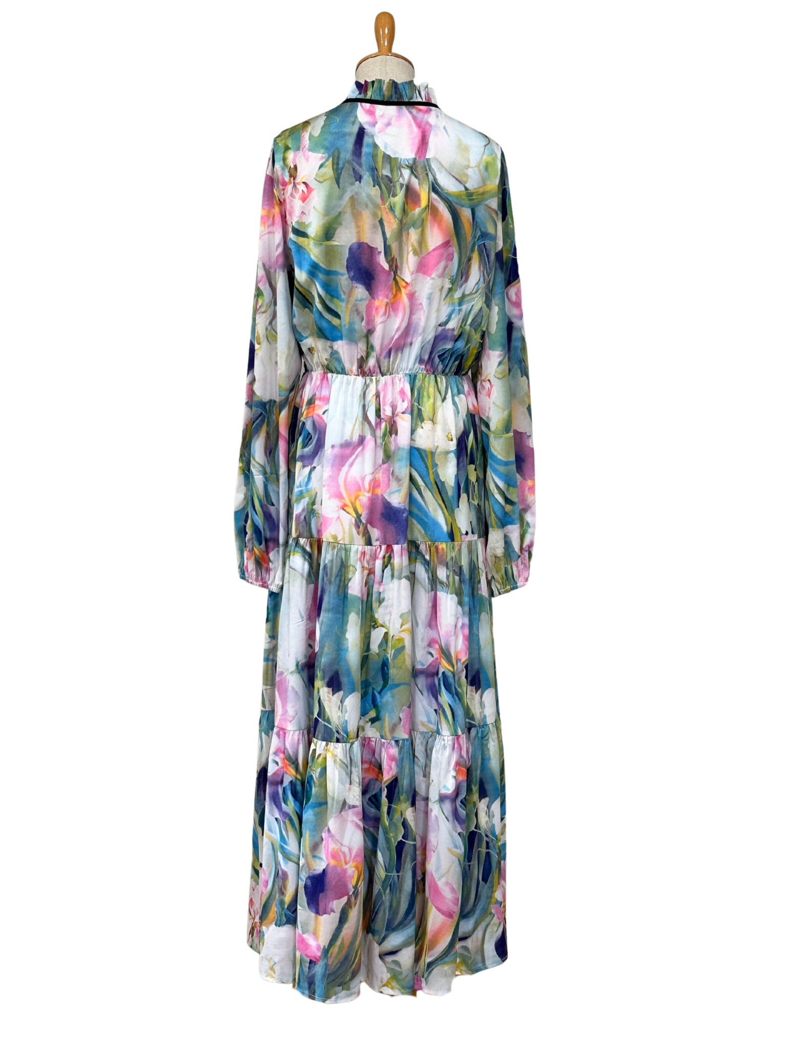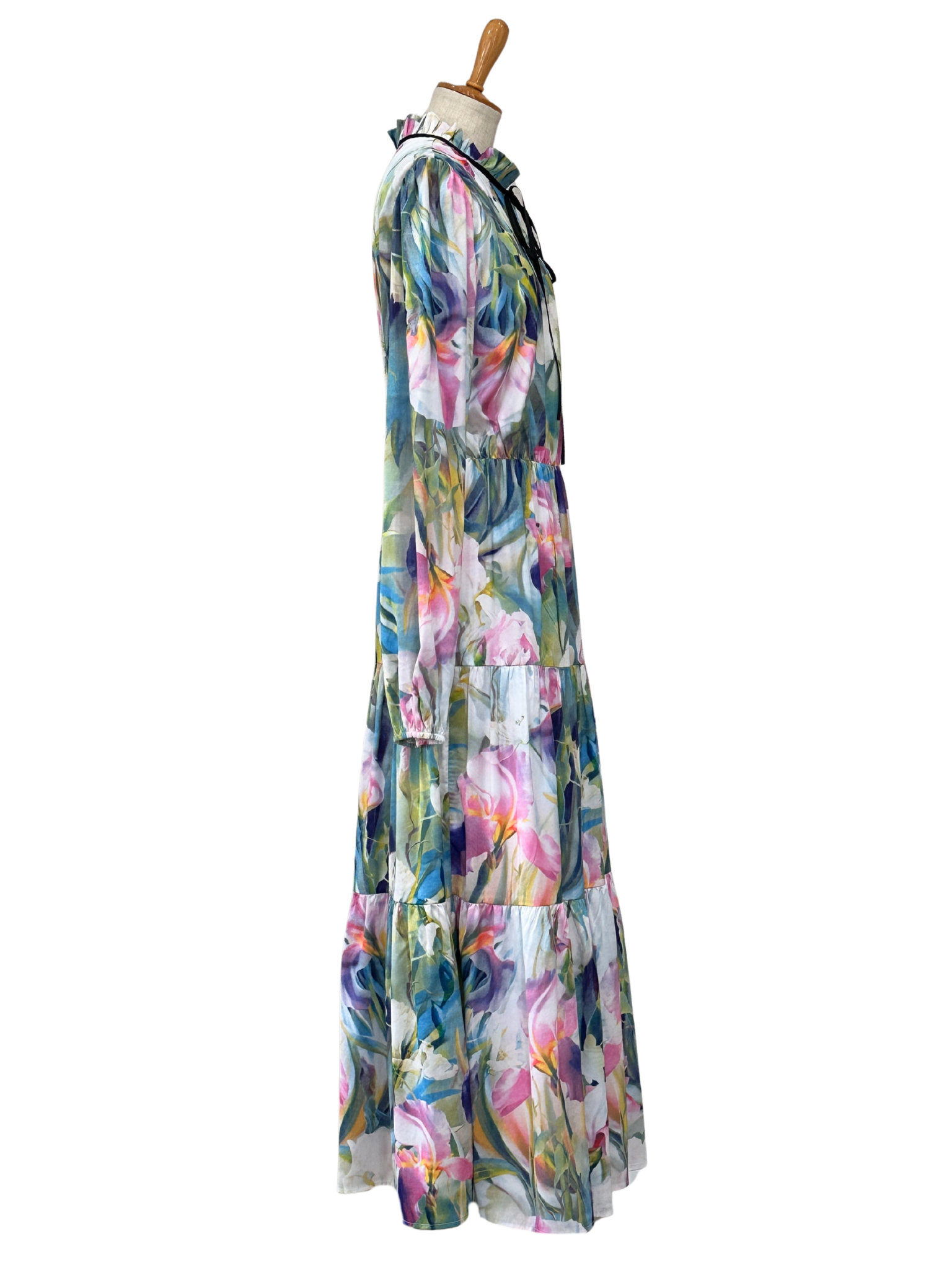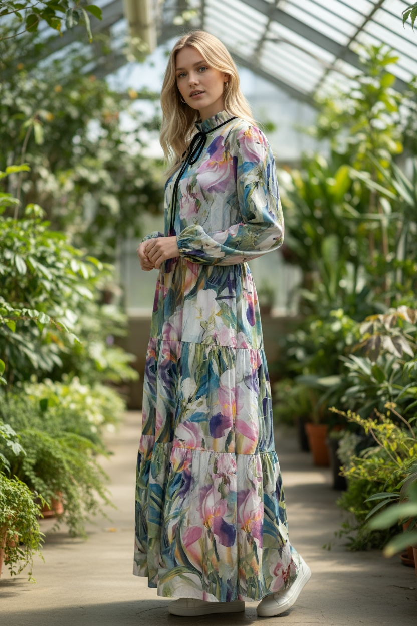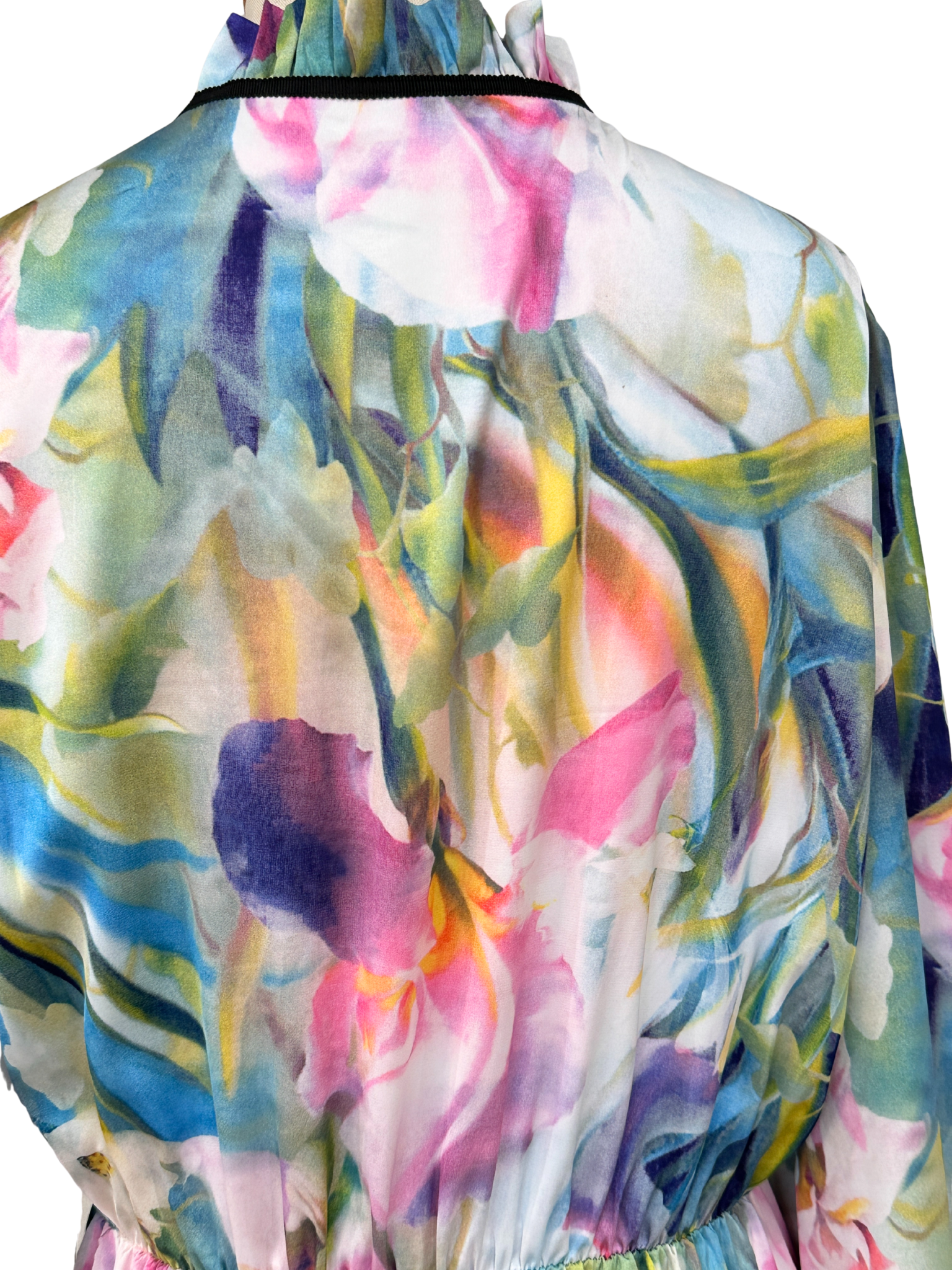 淡いパステルカラーの花々が、抽象画のように溶け合うフラワープリントが印象的なワンピース。