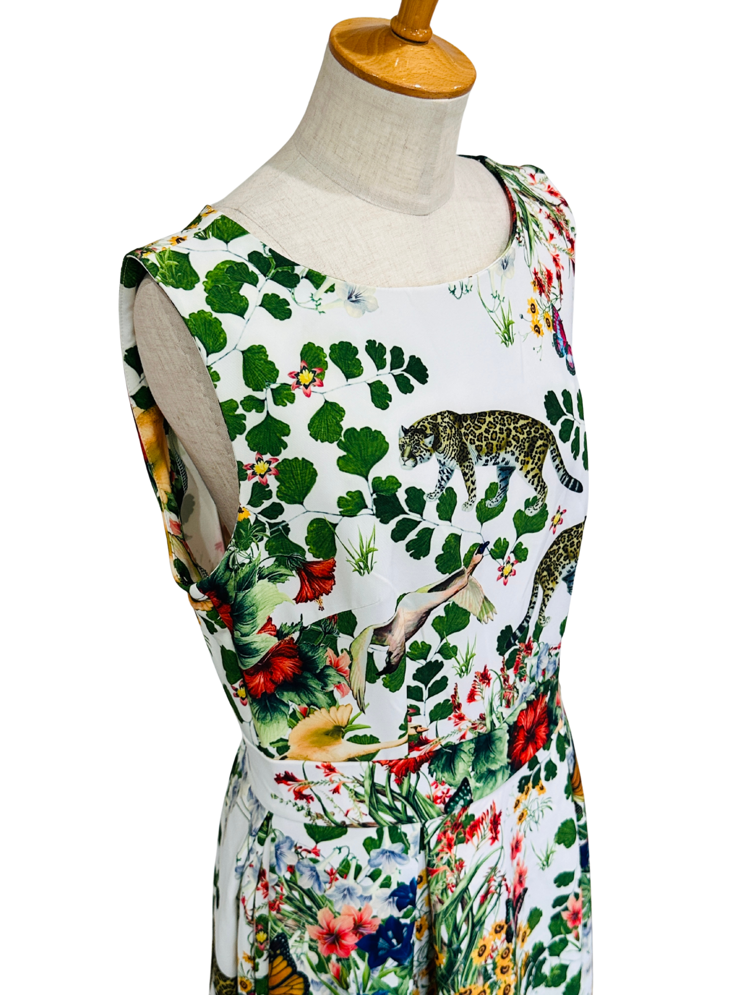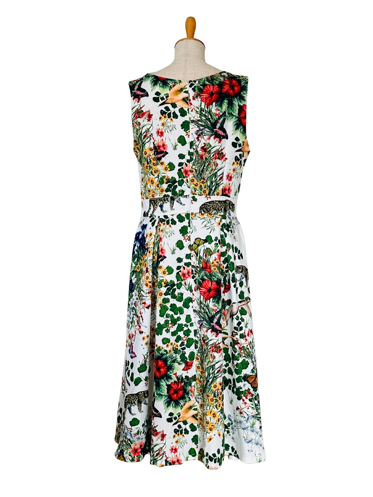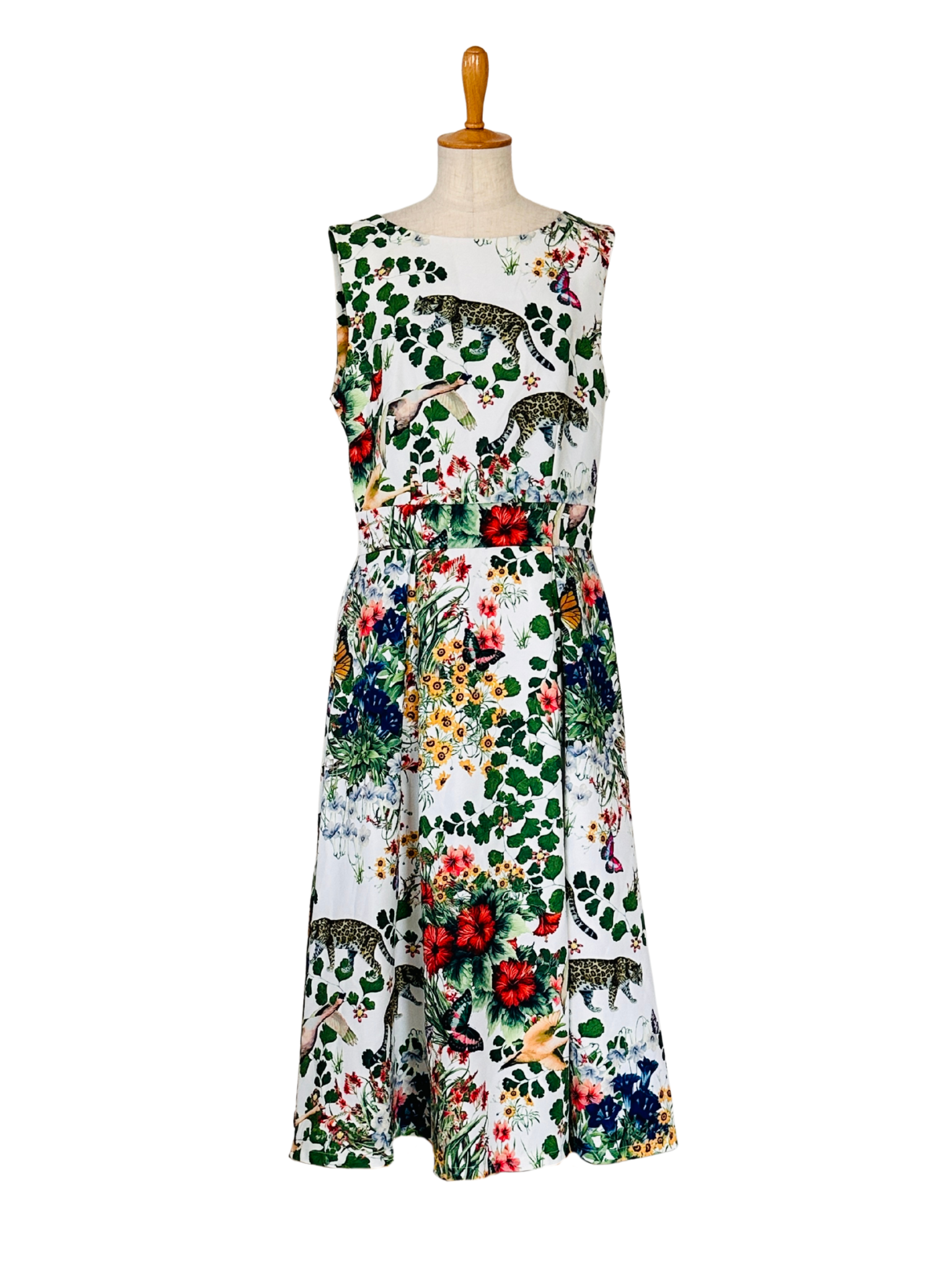白地に咲き誇る色とりどりの花々に、さりげなく姿を見せる動物たち——まるで物語の中に迷い込んだような、遊び心あふれるフラワードレス。