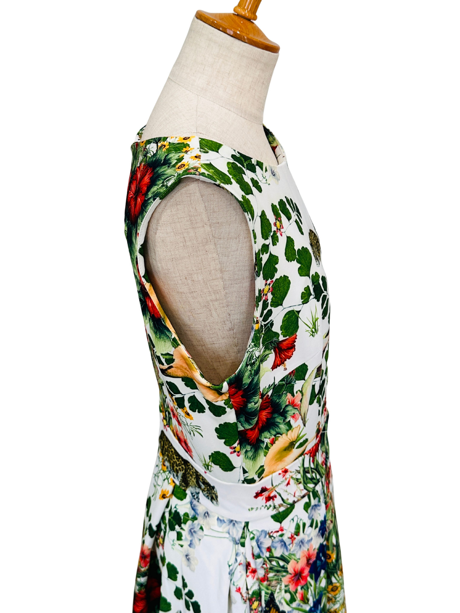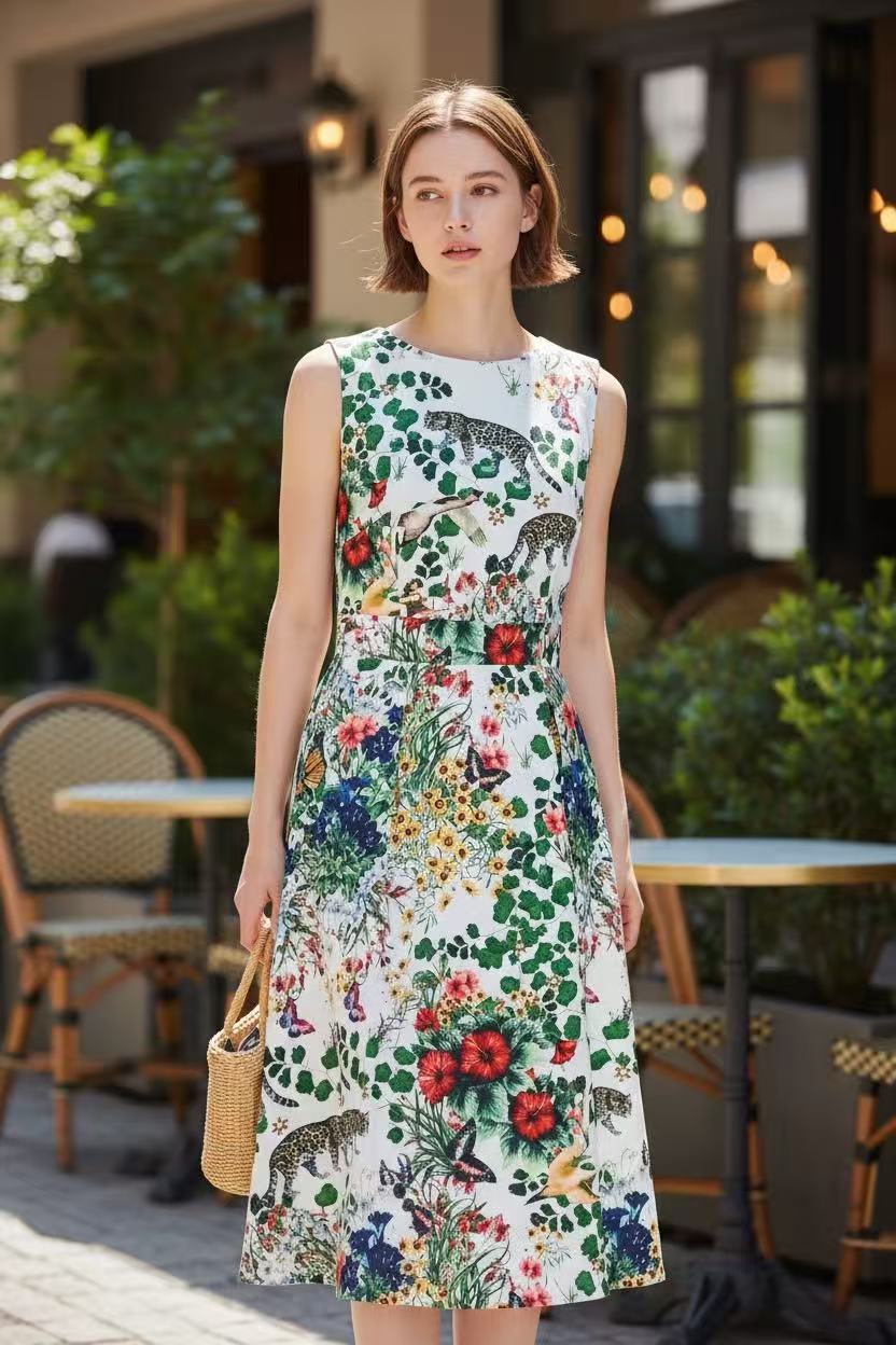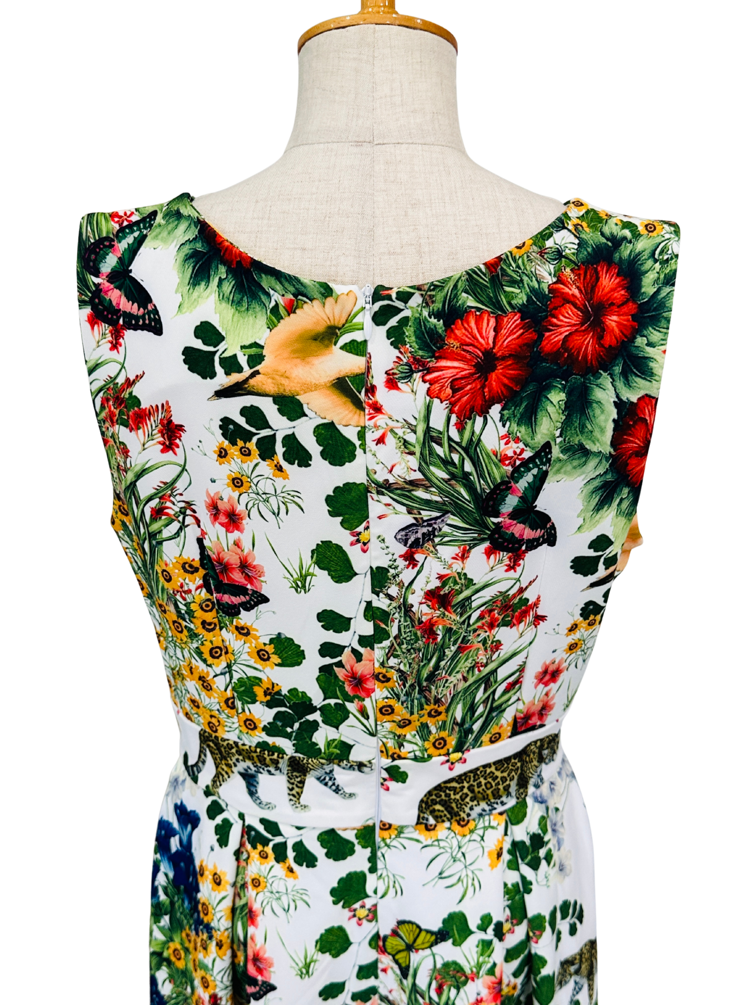 白地に咲き誇る色とりどりの花々に、さりげなく姿を見せる動物たち——まるで物語の中に迷い込んだような、遊び心あふれるフラワードレス。