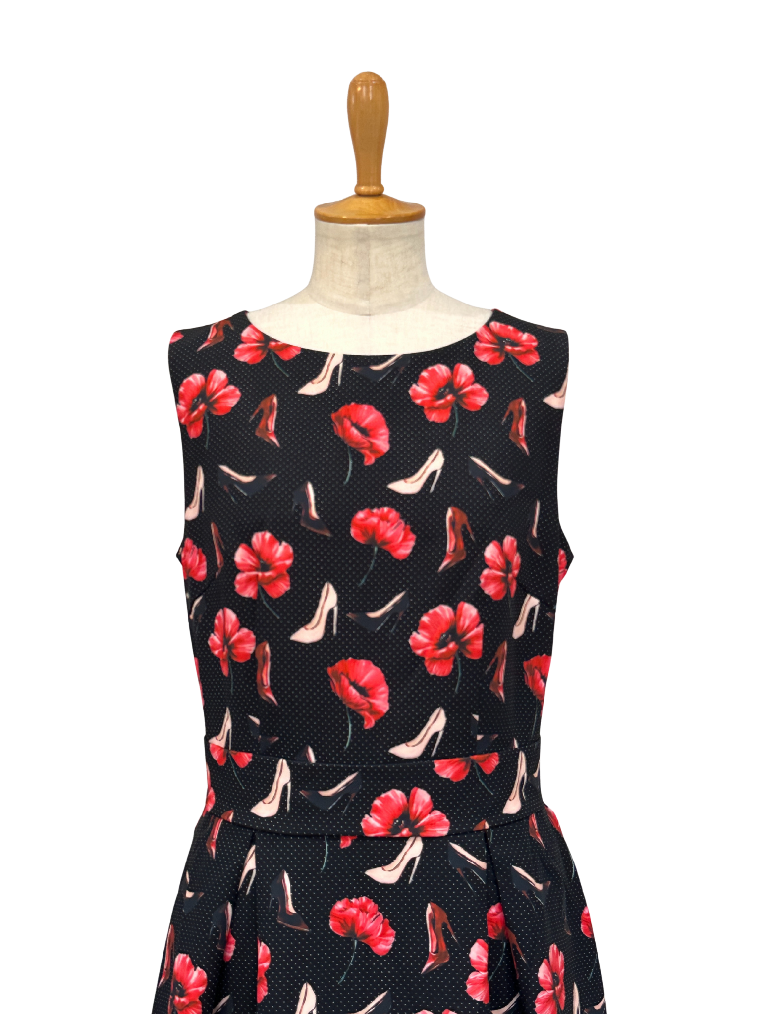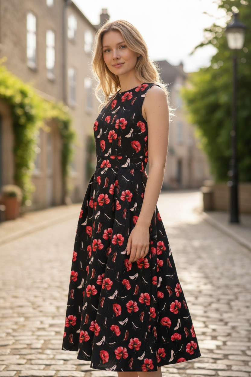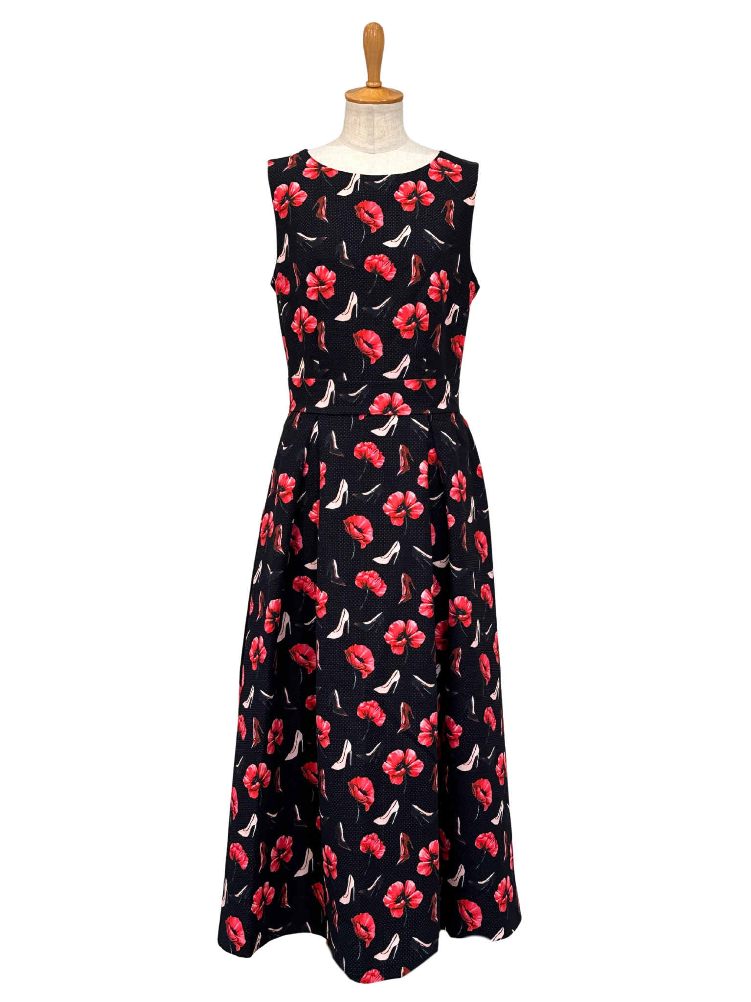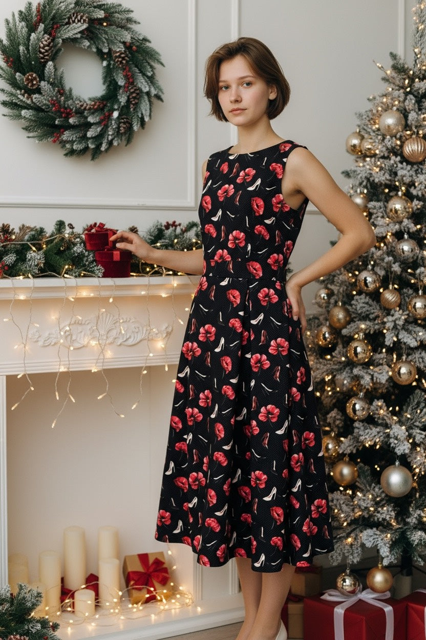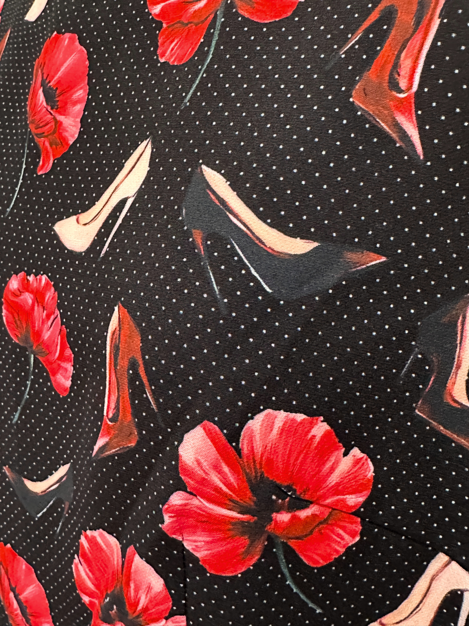 ブラックベースに浮かぶ赤の花に、さりげなく散りばめられたハイヒールモチーフが、エレガンスと遊び心を絶妙なバランスで表現。