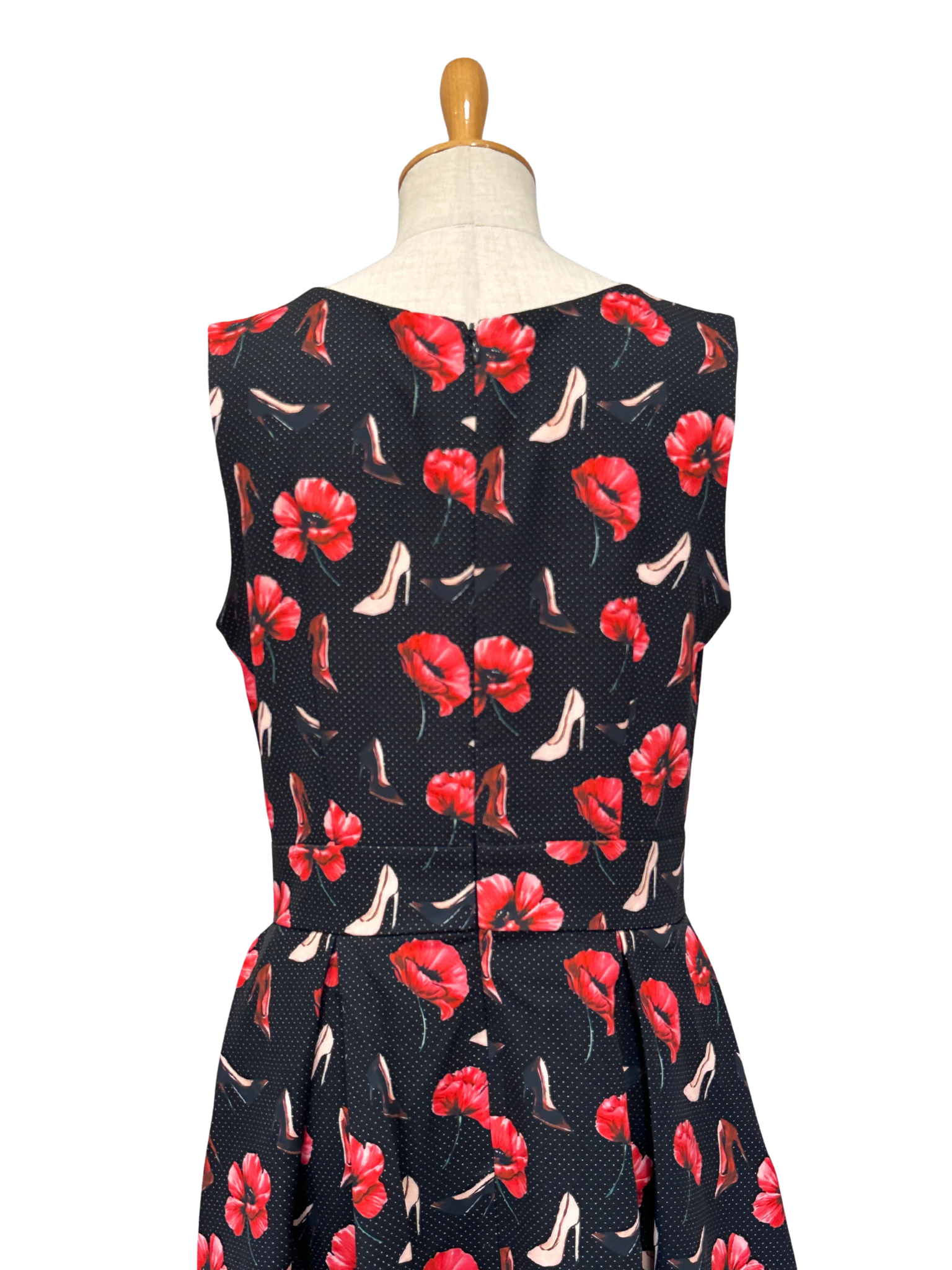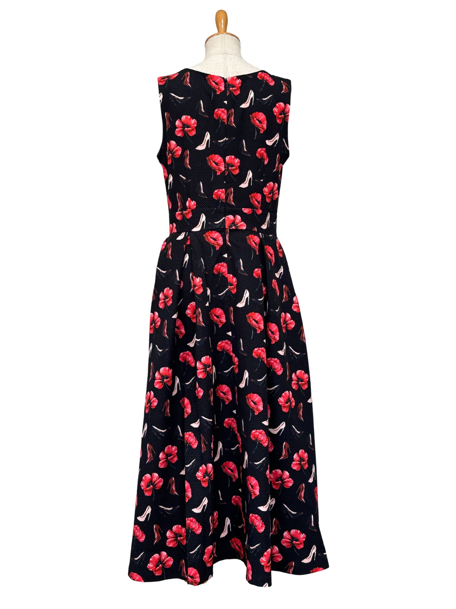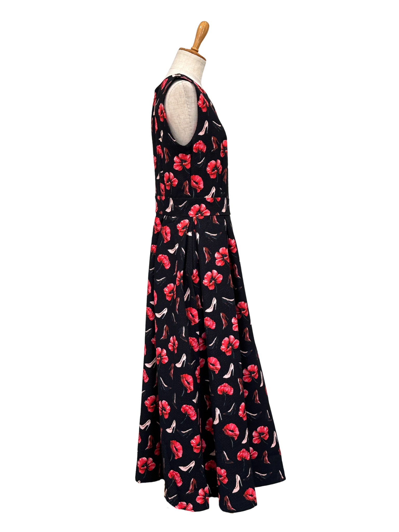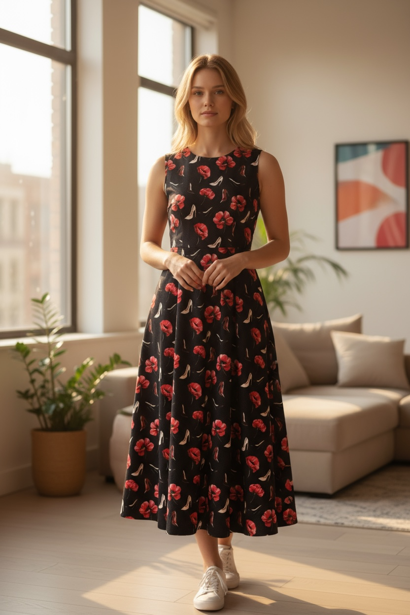 ブラックベースに浮かぶ赤の花に、さりげなく散りばめられたハイヒールモチーフが、エレガンスと遊び心を絶妙なバランスで表現。