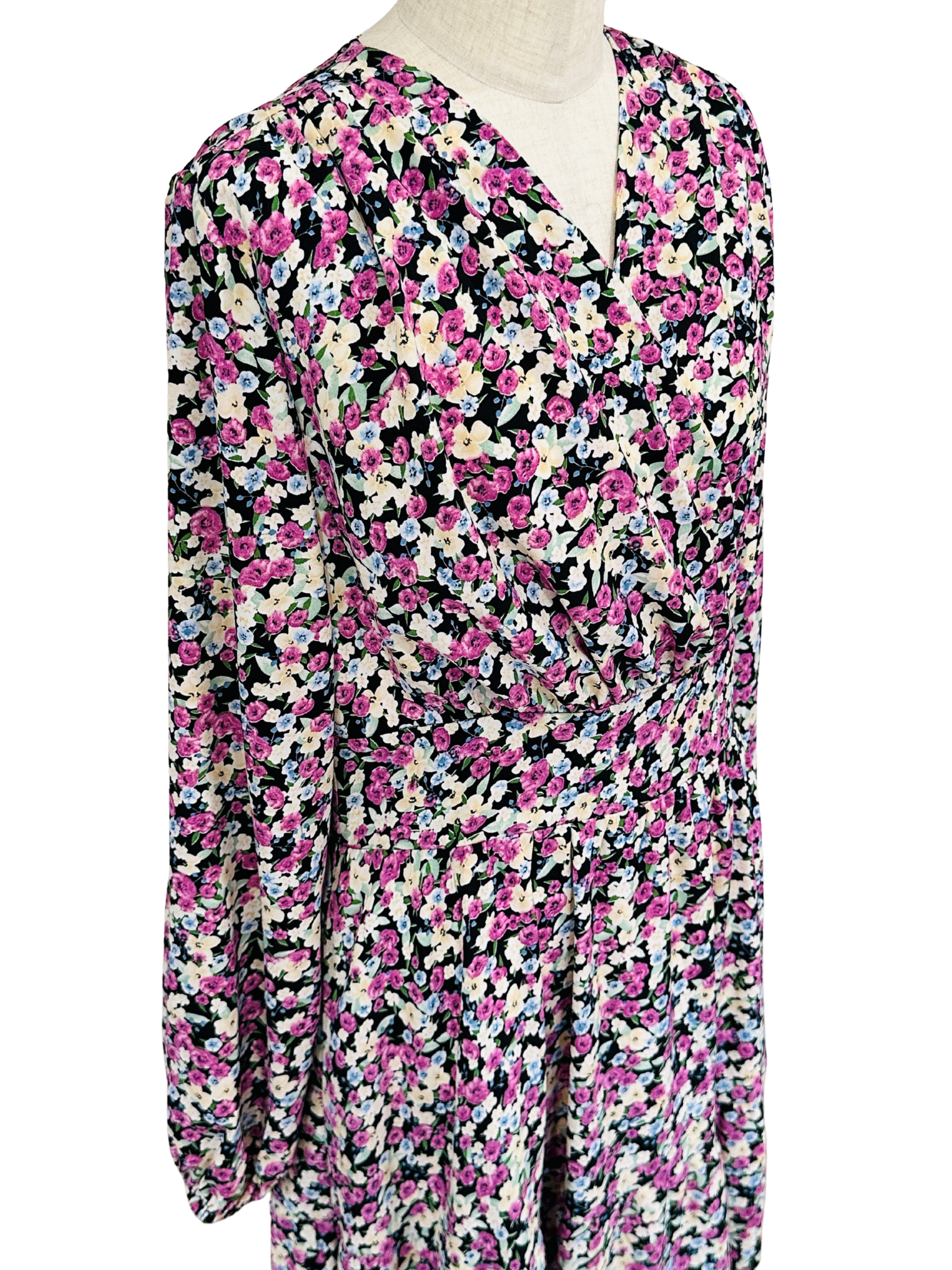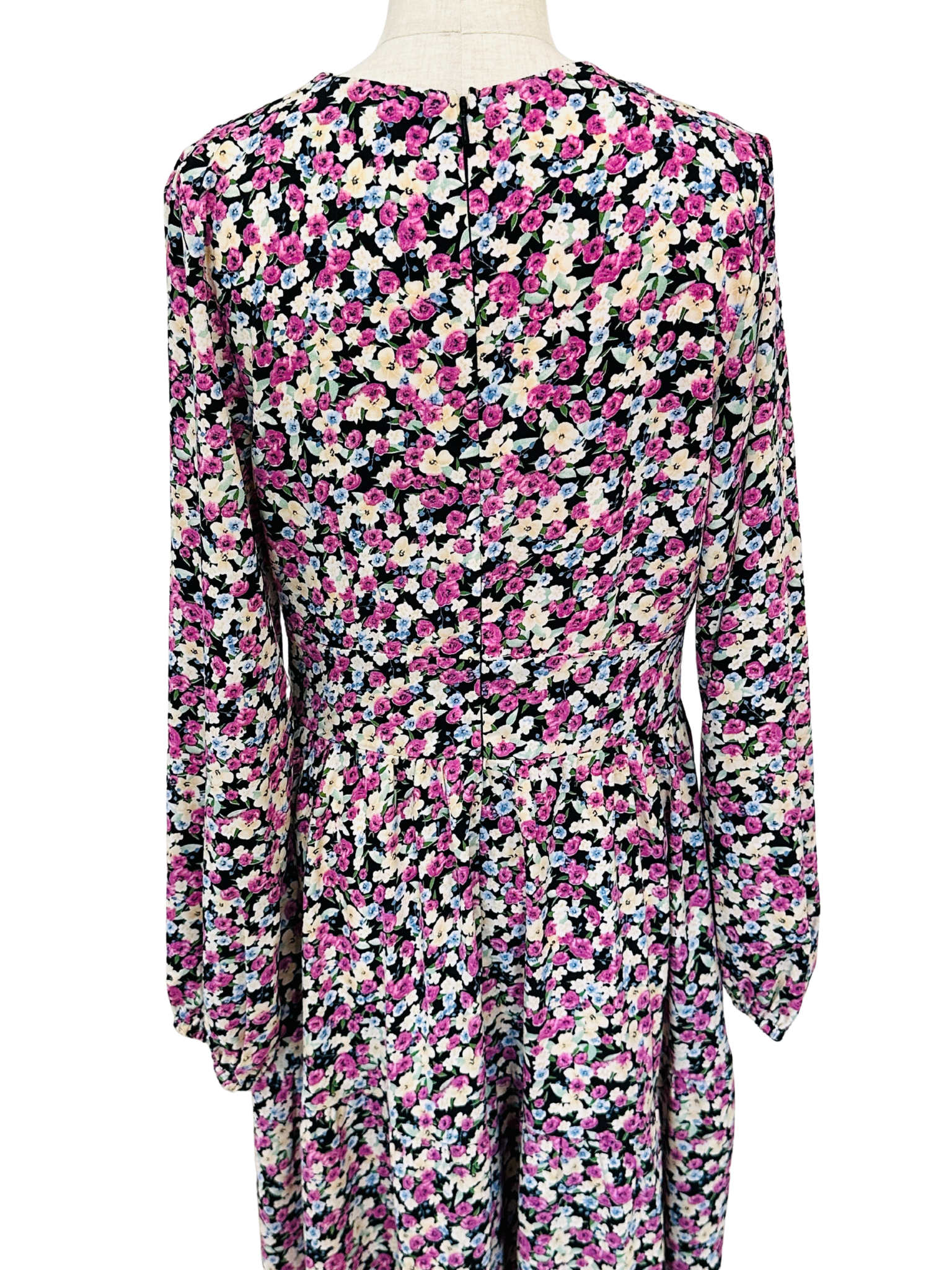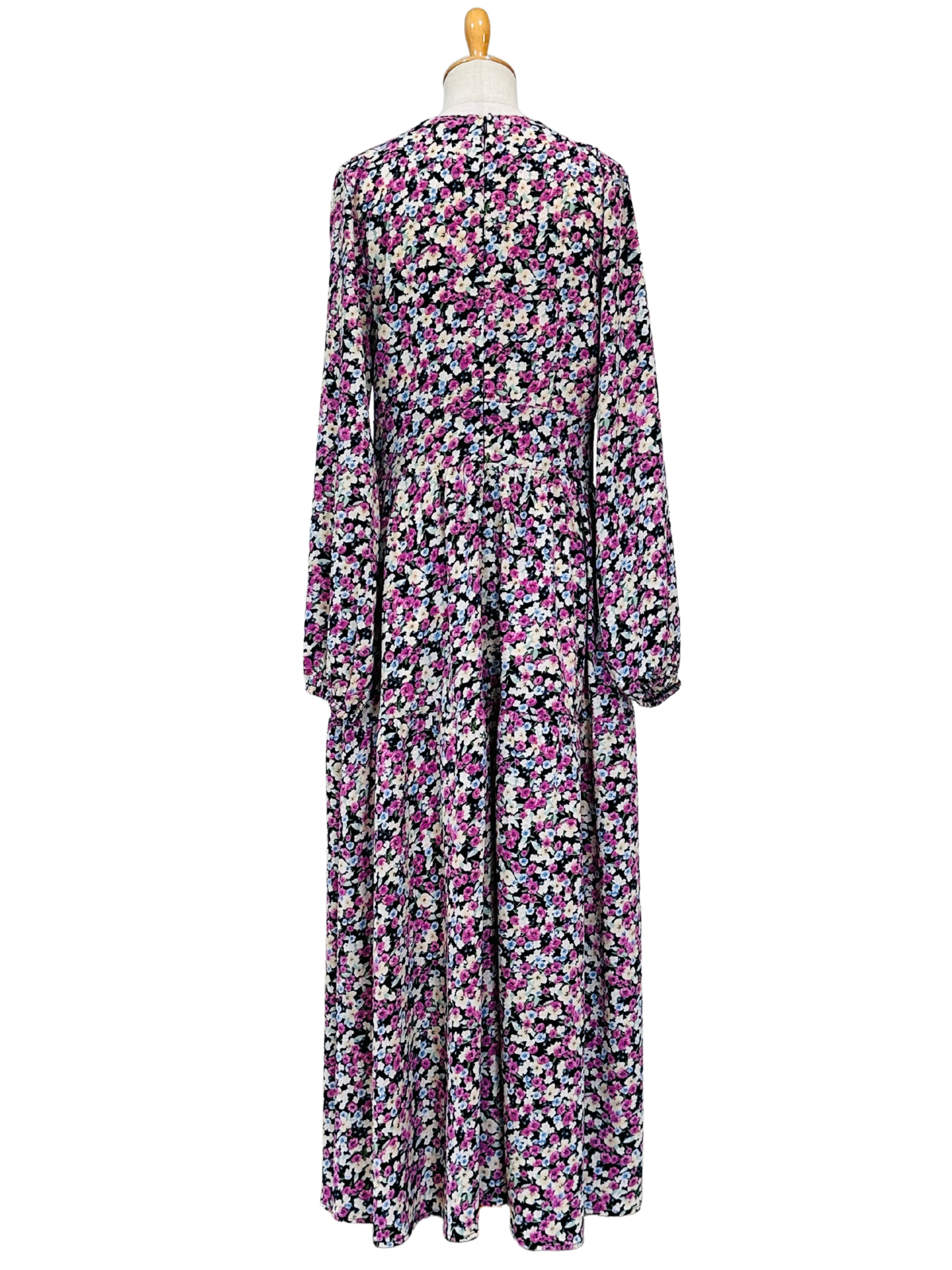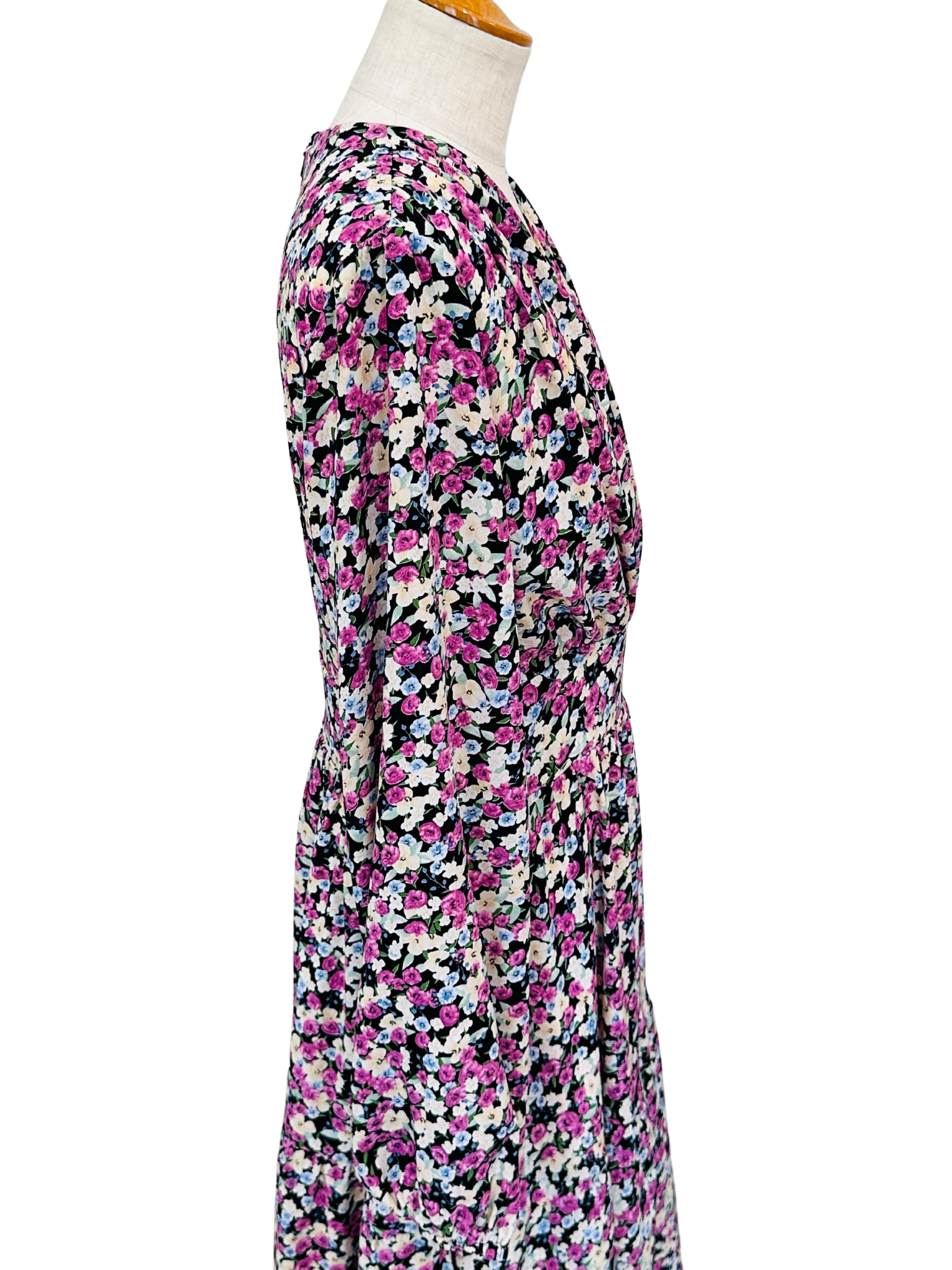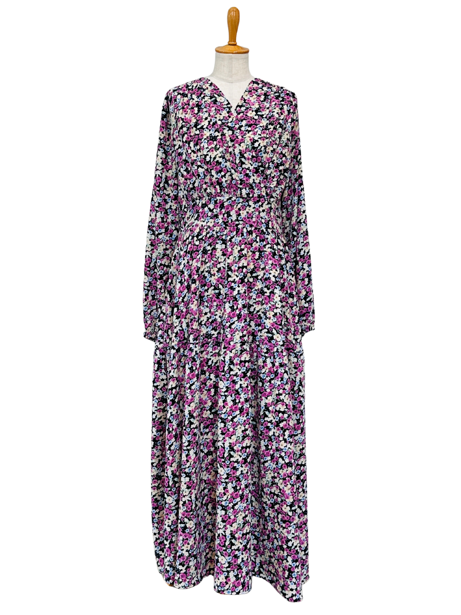 ブラックベースにピンク・パープル・ホワイトの小花が映え、甘すぎず大人の可愛らしさを引き出します。