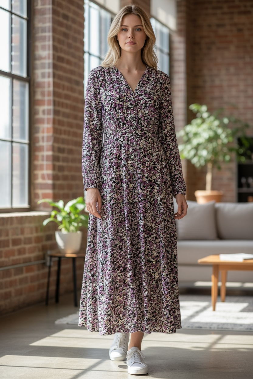 深めのVネックがデコルテを美しく引き立て、ウエストのギャザーが自然な立体感とメリハリを演出。ロングスリーブはふんわりとしたボリュームがあり、袖口でキュッと締まることで、クラシカルな印象に。スカートはティアード仕様で、歩くたびにふわりと揺れる軽やかさ。