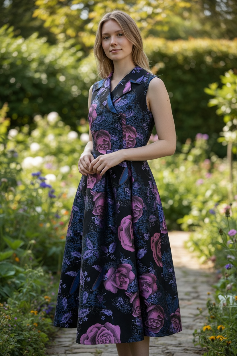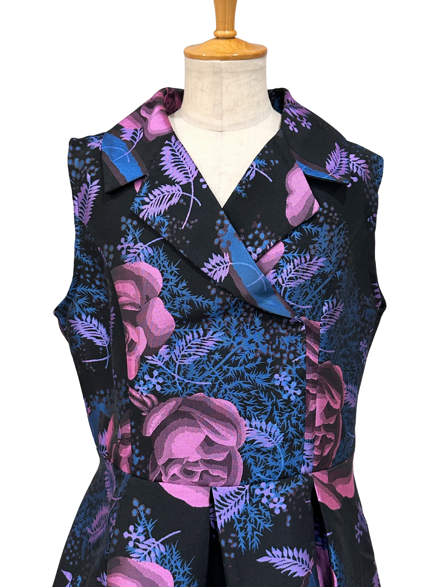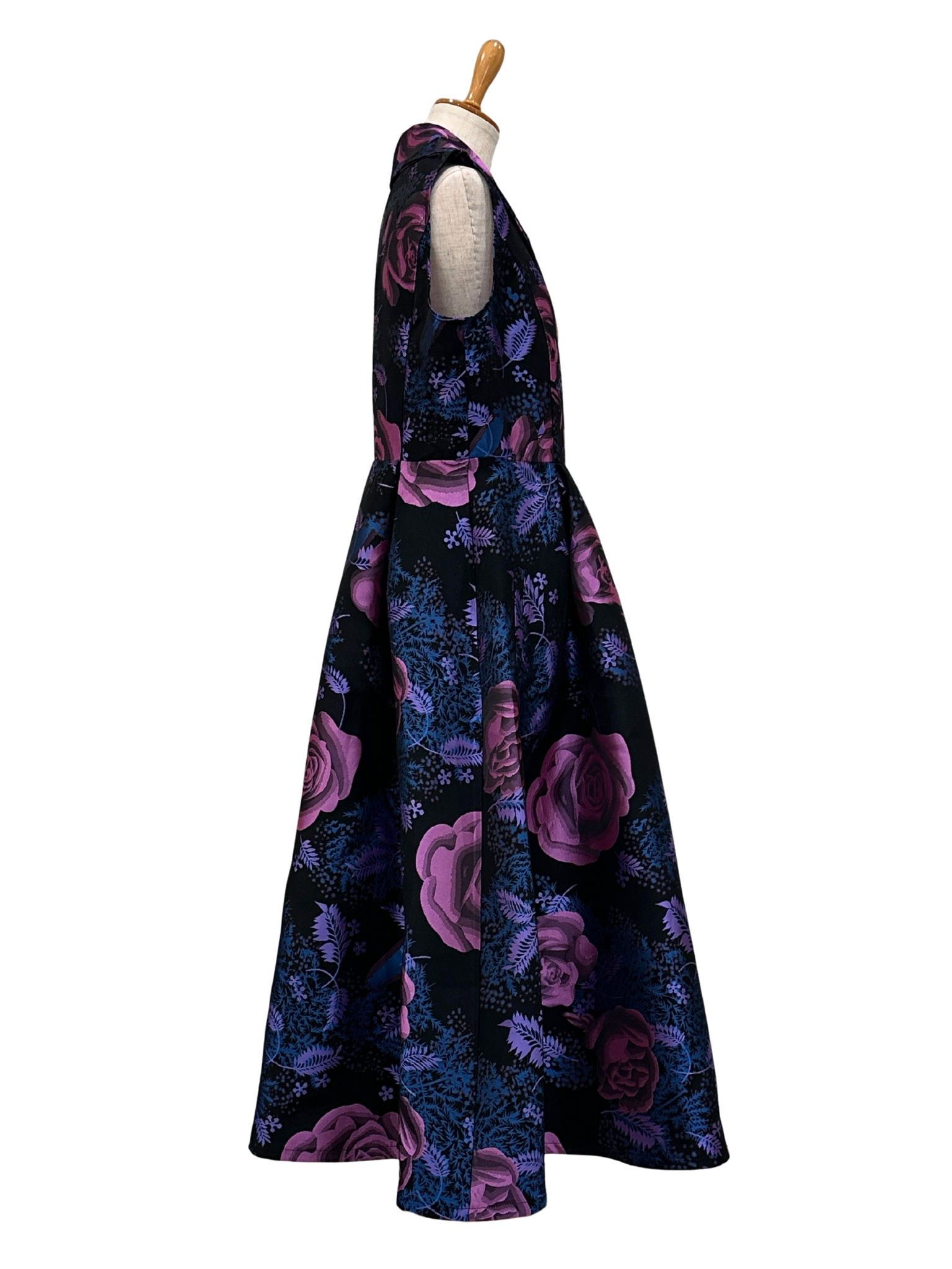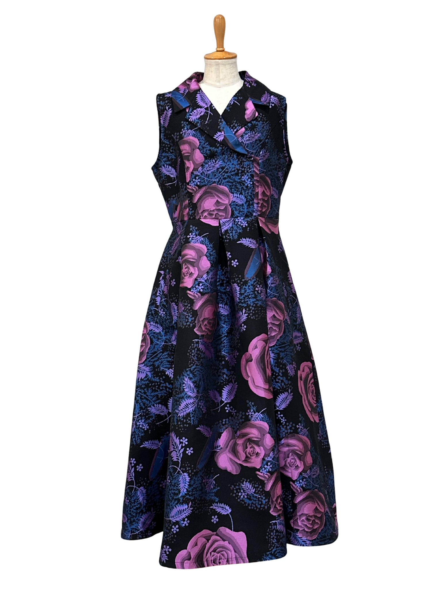 深いブラックベースに浮かび上がる、大輪のパープルローズとブルーのリーフが、まるで絵画のようにドラマティックな存在感を放つノースリーブワンピース。