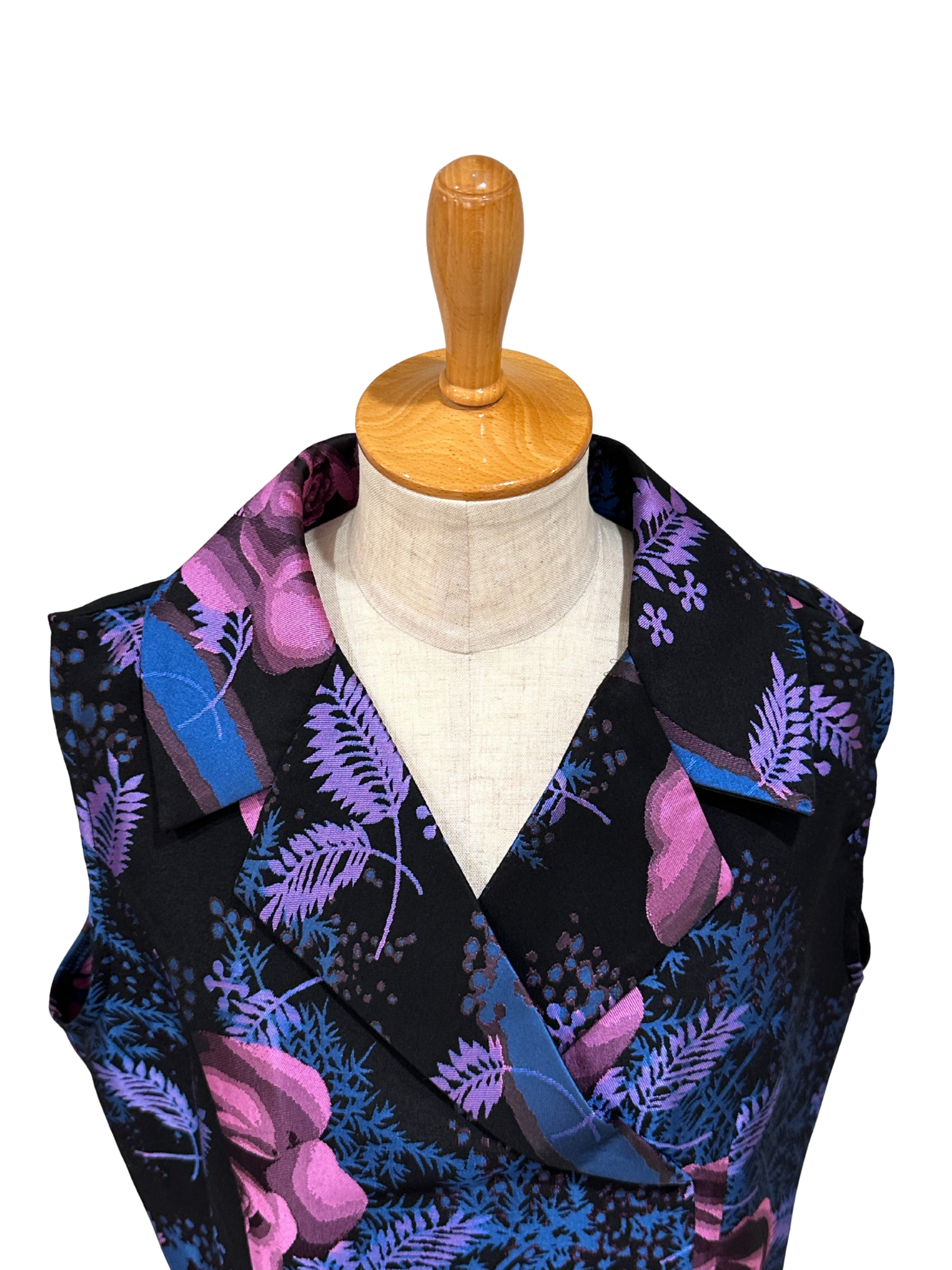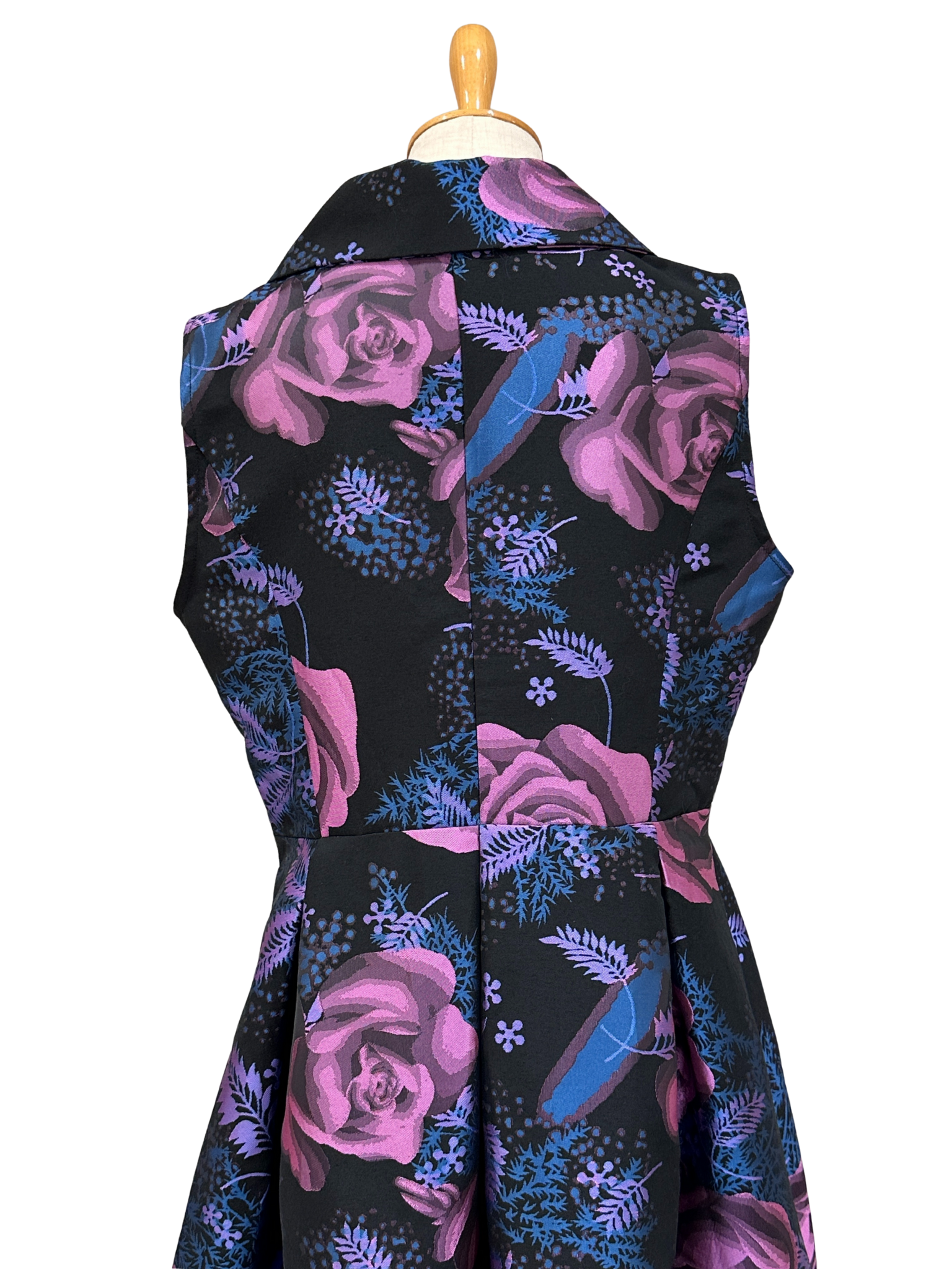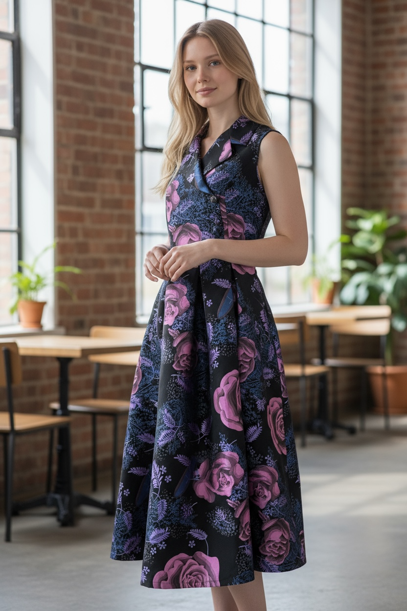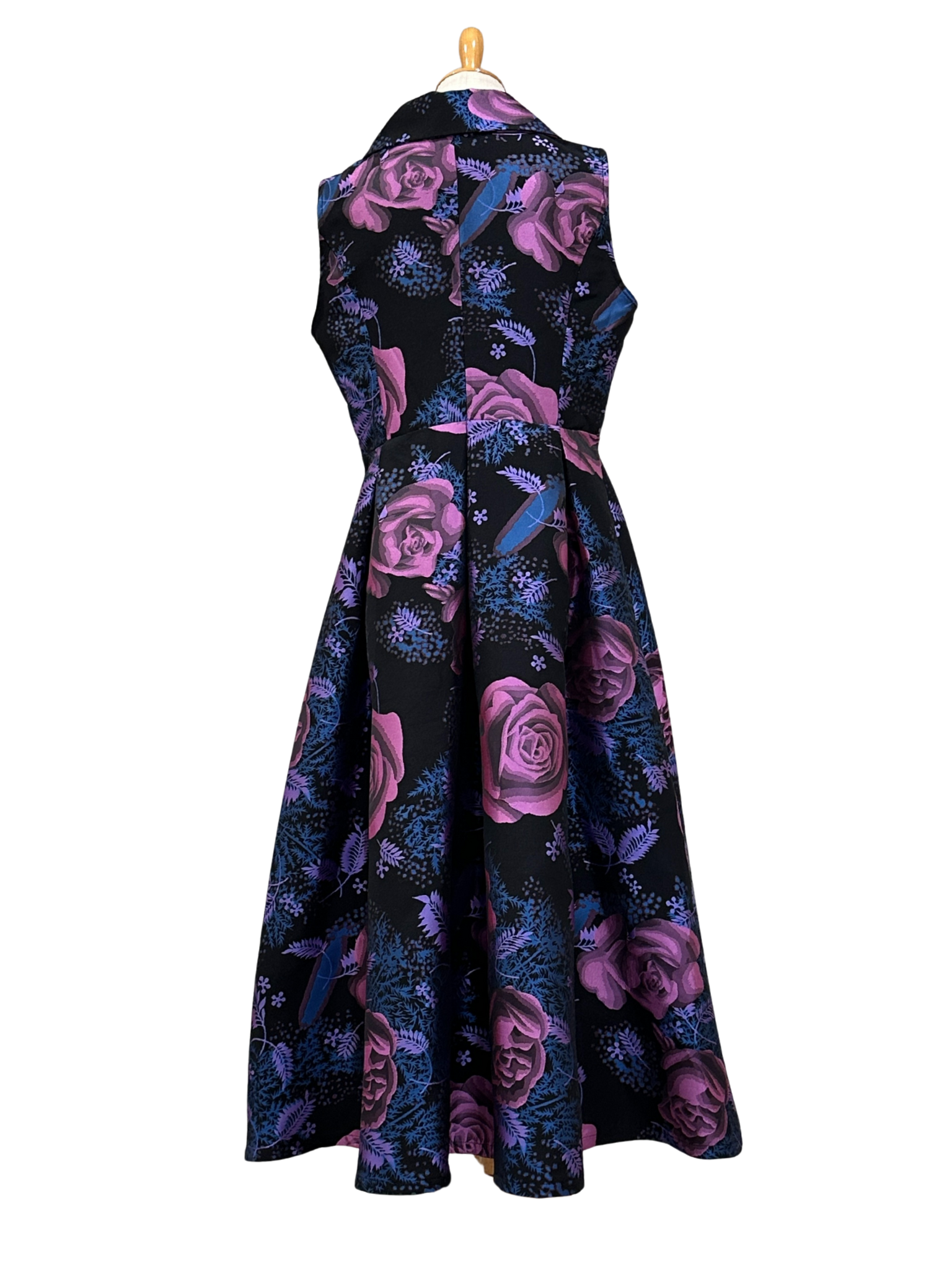 深いブラックベースに浮かび上がる、大輪のパープルローズとブルーのリーフが、まるで絵画のようにドラマティックな存在感を放つノースリーブワンピース。
