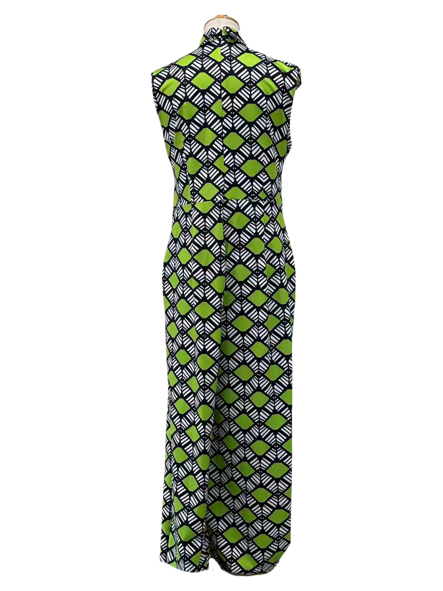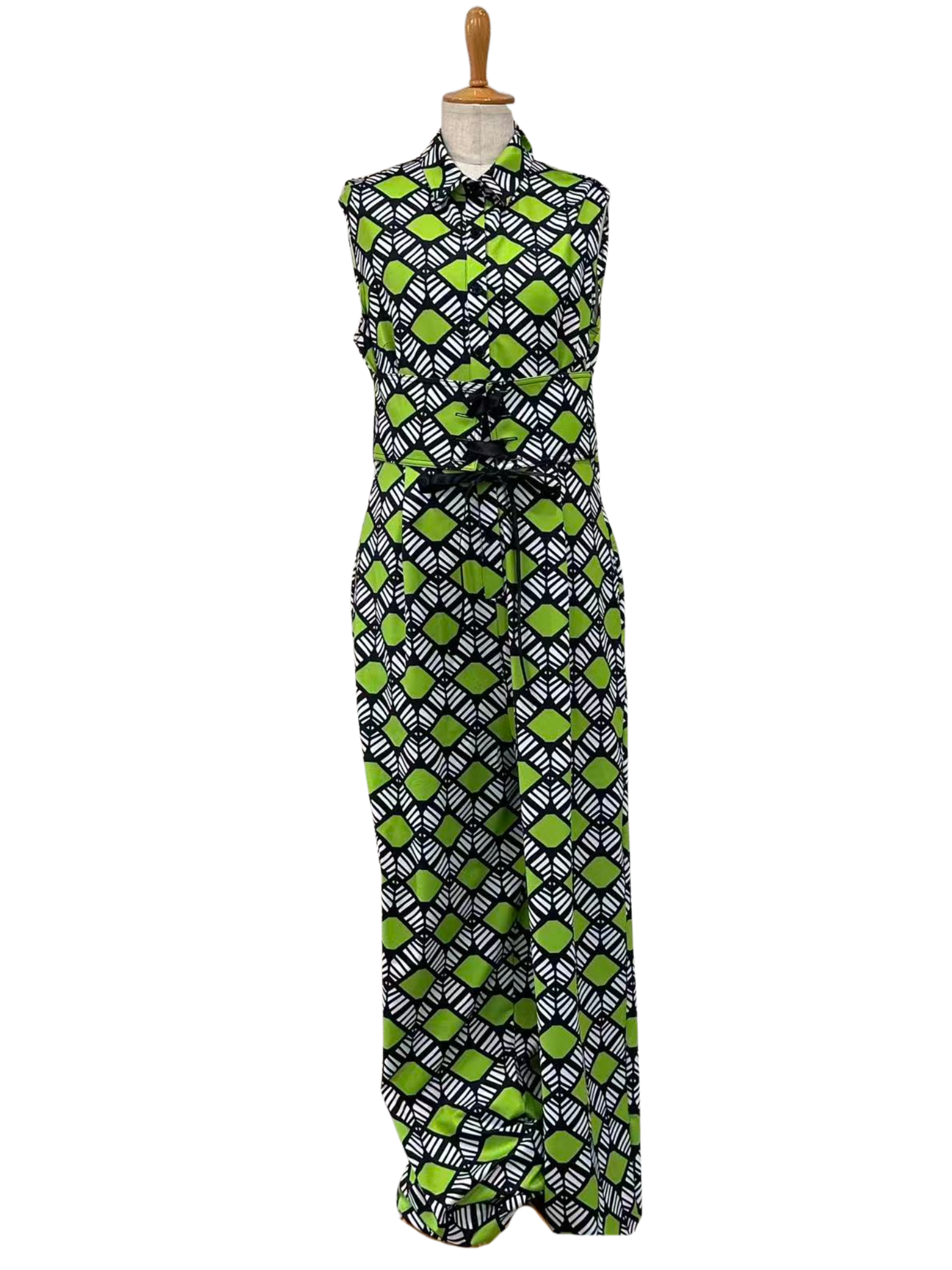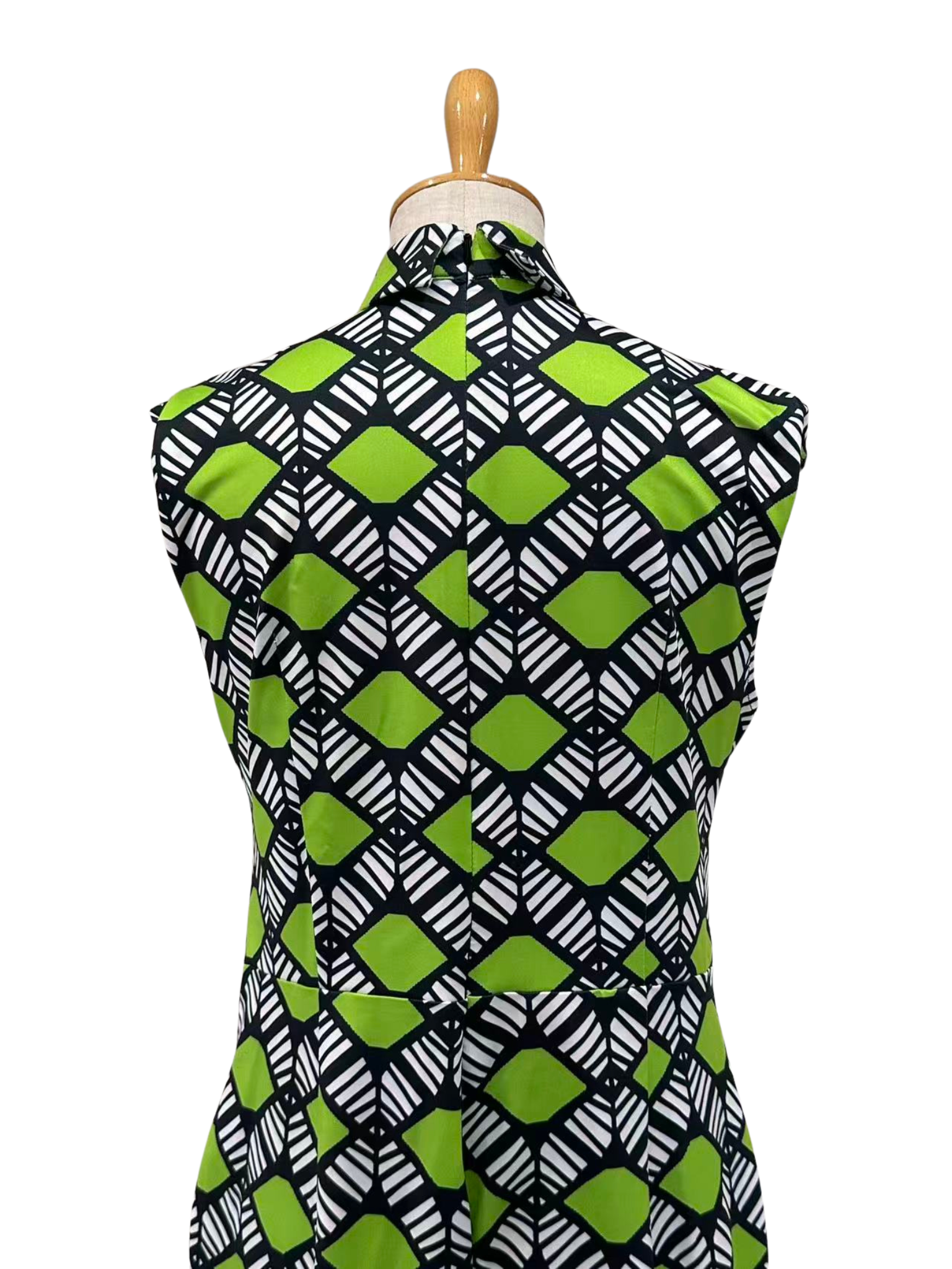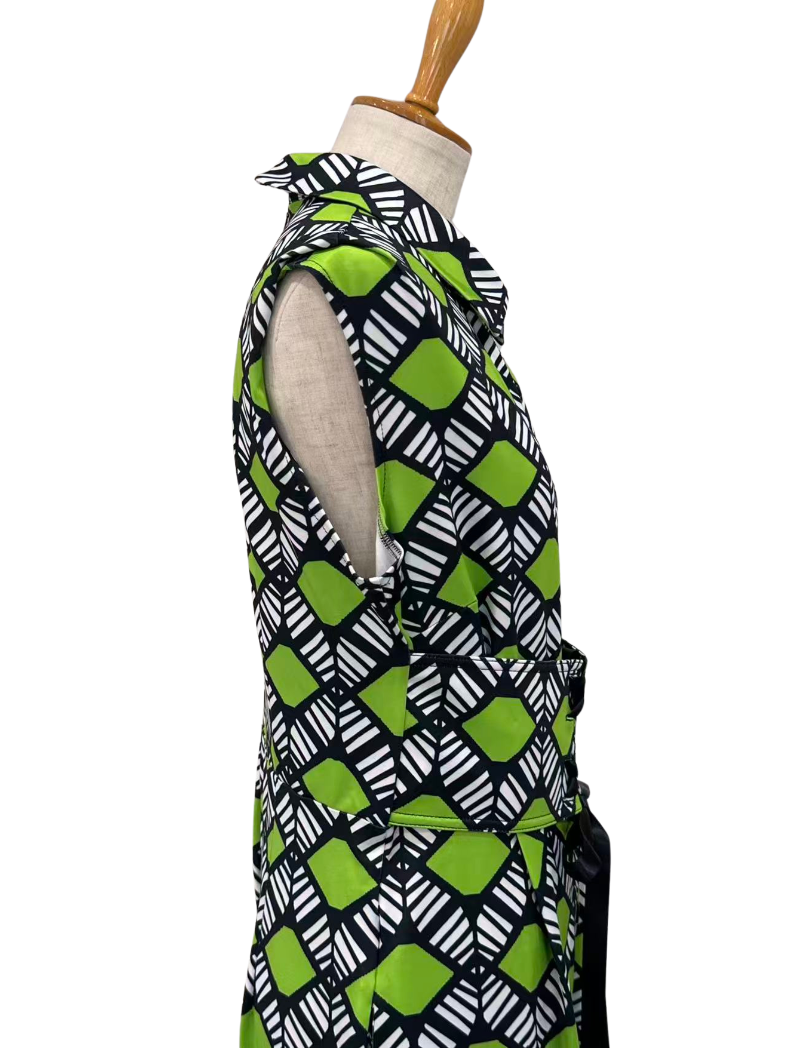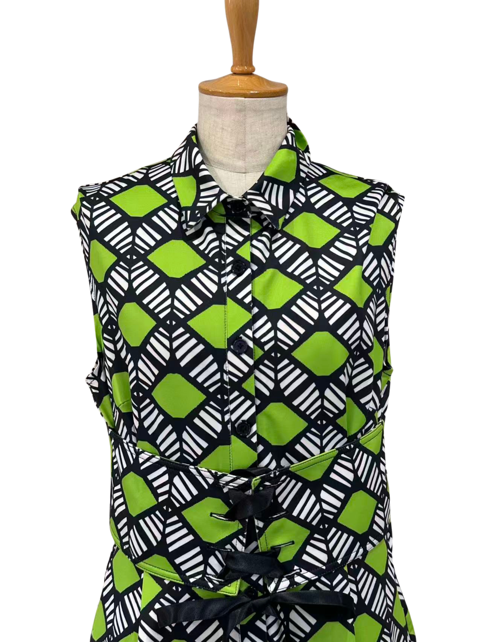 ライトグリーン×ホワイト×ブラックの配色がモダンな存在感を放ち、襟付きのデザインとフロントボタンがきちんと感を演出。